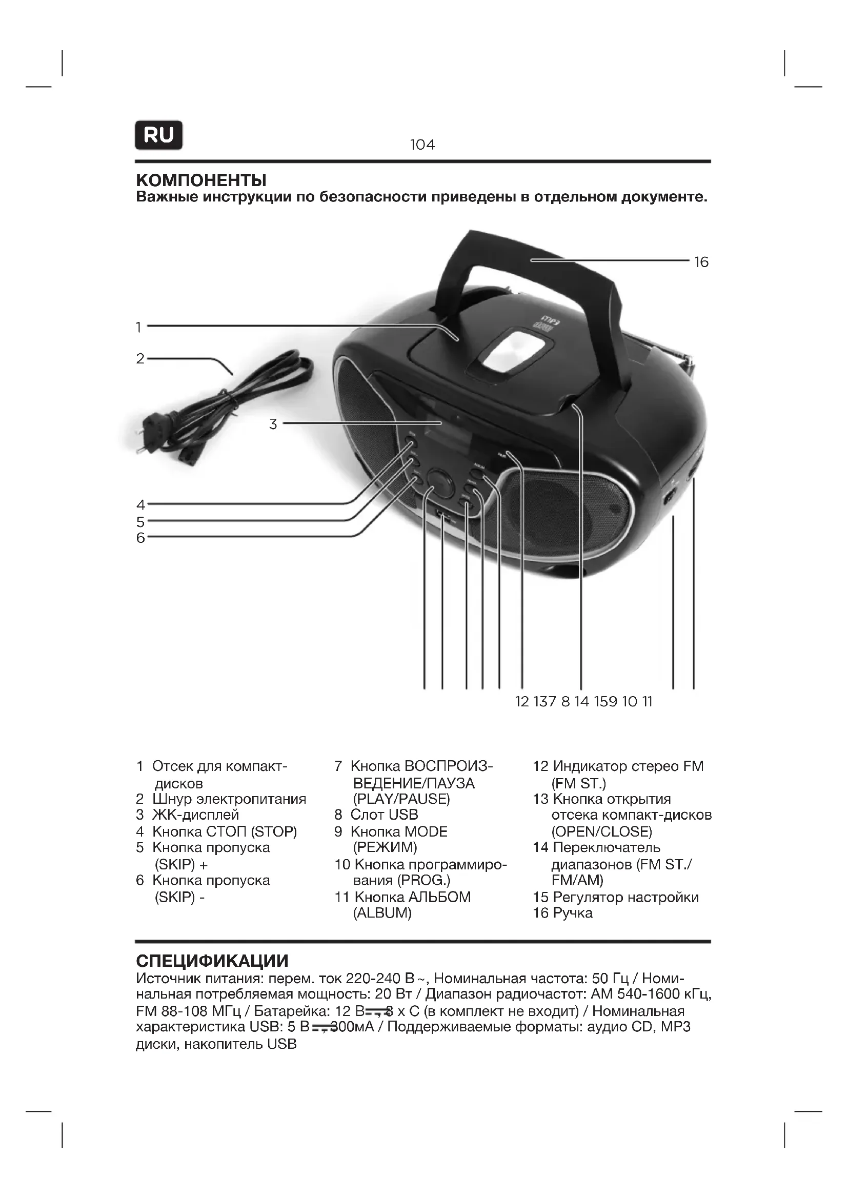 , Номинальная частота: 50 Гц / Номи- нальная потребляемая мощность: 20 Вт / Диапазон радиочастот: AM 540-1600 кГц, FM 88-108 МГц / Батарейка: 12 В , 8 x C (в комплект не входит) / Номинальная характеристика USB: 5 В , 300мА / Поддерживаемые форматы: аудио CD, MP3 диски, накопитель USB СПЕЦИФИКАЦИИ Важные инструкции по безопасности приведены в отдельном документе.