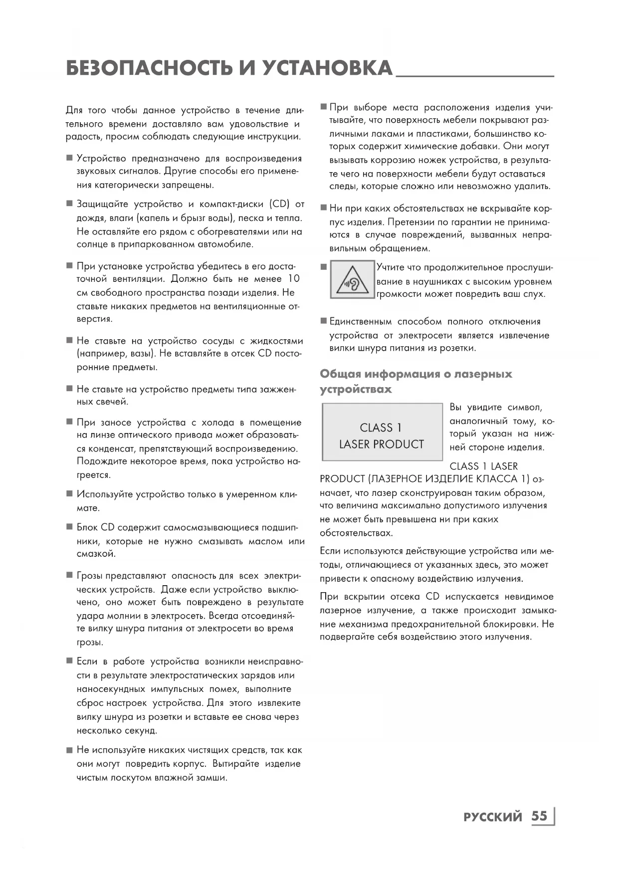 Единственным способом полного отключения устройства от электросети является извлечение вилки шнура питания из розетки. Общая информация о лазерных устройствах CLASS 1 LASER PRODUCT Вы увидите символ, аналогичный тому, ко- торый указан на ниж- ней стороне изделия. CLASS 1 LASER PRODUCT (ЛАЗЕРНОЕ ИЗДЕЛИЕ КЛАССА 1) оз- начает, что лазер сконструирован таким образом, что величина максимально допустимого излучения не может быть превышена ни при каких обстоятельствах. Если используются действующие устройства или ме- тоды, отличающиеся от указанных здесь, это может привести к опасному воздействию излучения. При вскрытии отсека CD испускается невидимое лазерное излучение, а также происходит замыка- ние механизма предохранительной блокировки. Не подвергайте себя воздействию этого излучения. Для того чтобы данное устройство в течение дли- тельного времени доставляло вам удовольствие и радость, просим соблюдать следующие инструкции.