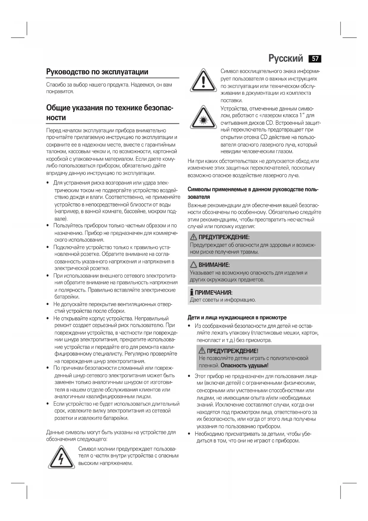 Устройства, отмеченные данным симво- лом, работают с «лазером класса 1“ для считываниядисковCD.Встроенныйзащит- ный переключатель предотвращает при открытии отсека CD действие на пользо- вателя опасного лазерного луча, который невидим человеческим глазом. Ни при каких обстоятельствах не допускается обход или изменение этих защитных переключателей, поскольку возможно опасное воздействие лазерного луча. Символы применяемые в данном руководстве поль-