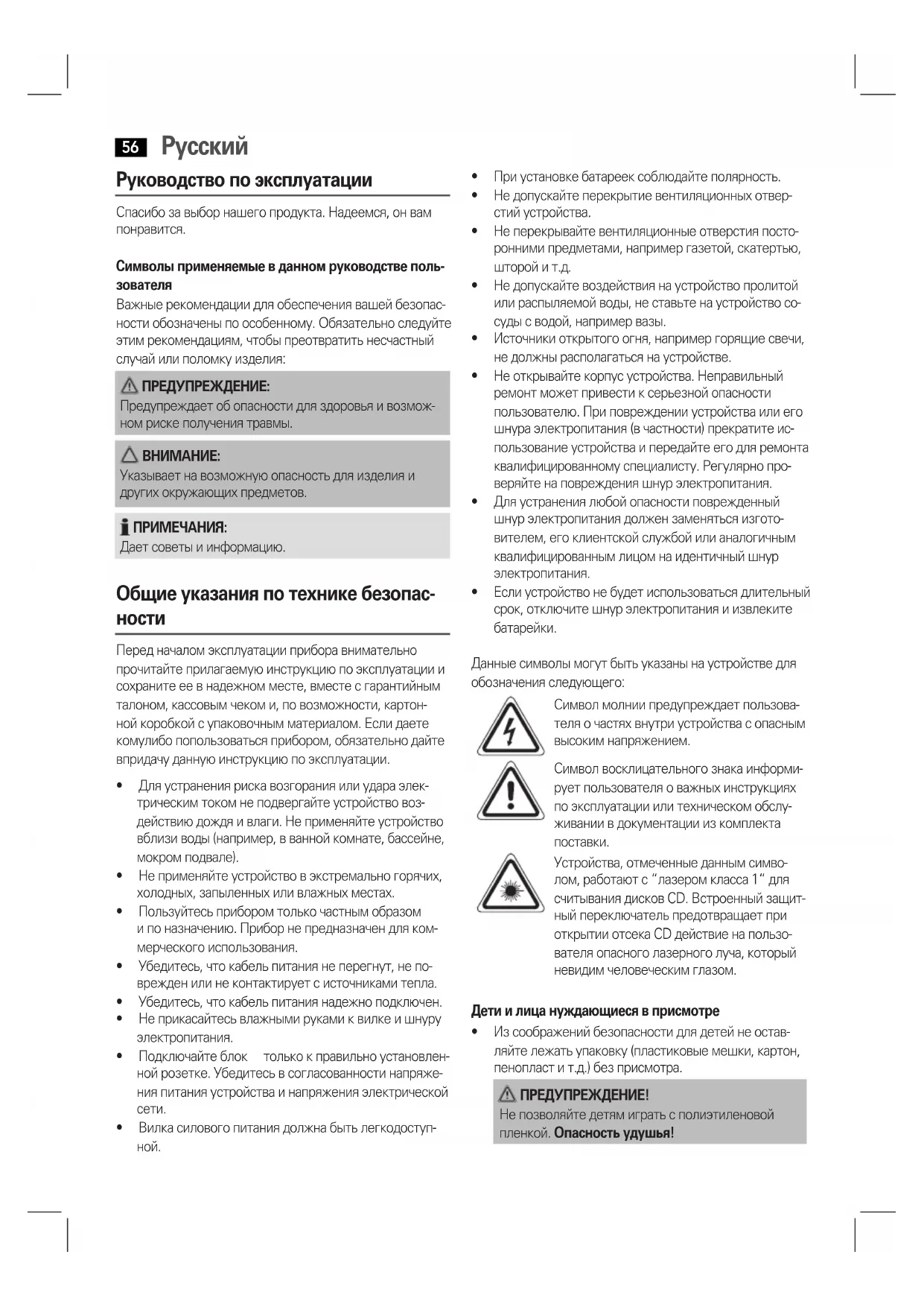 Устройства, отмеченные данным симво- лом, работают с “лазером класса 1“ для считывания дисков CD. Встроенный защит- ный переключатель предотвращает при открытии отсека CD действие на пользо- вателя опасного лазерного луча, который невидим человеческим глазом. Дети и лица нуждающиеся в присмотре