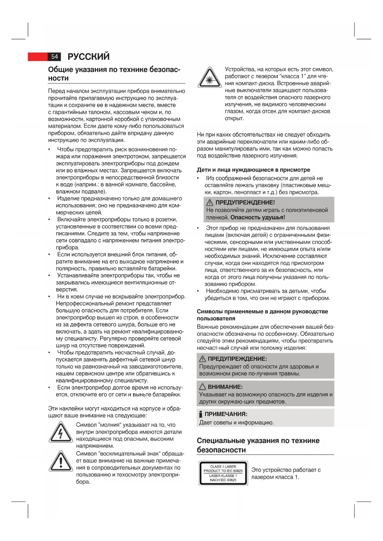 Устройства, на которых есть этот символ, работают с лезером “класса 1” для чте- ниякомпакт-диска.Встроенныеаварий- ные выключатели защищают пользова- теля от воздействия опасного лазерного излучения, не видимого человеческим глазом, когда отсек для компакт-дисков