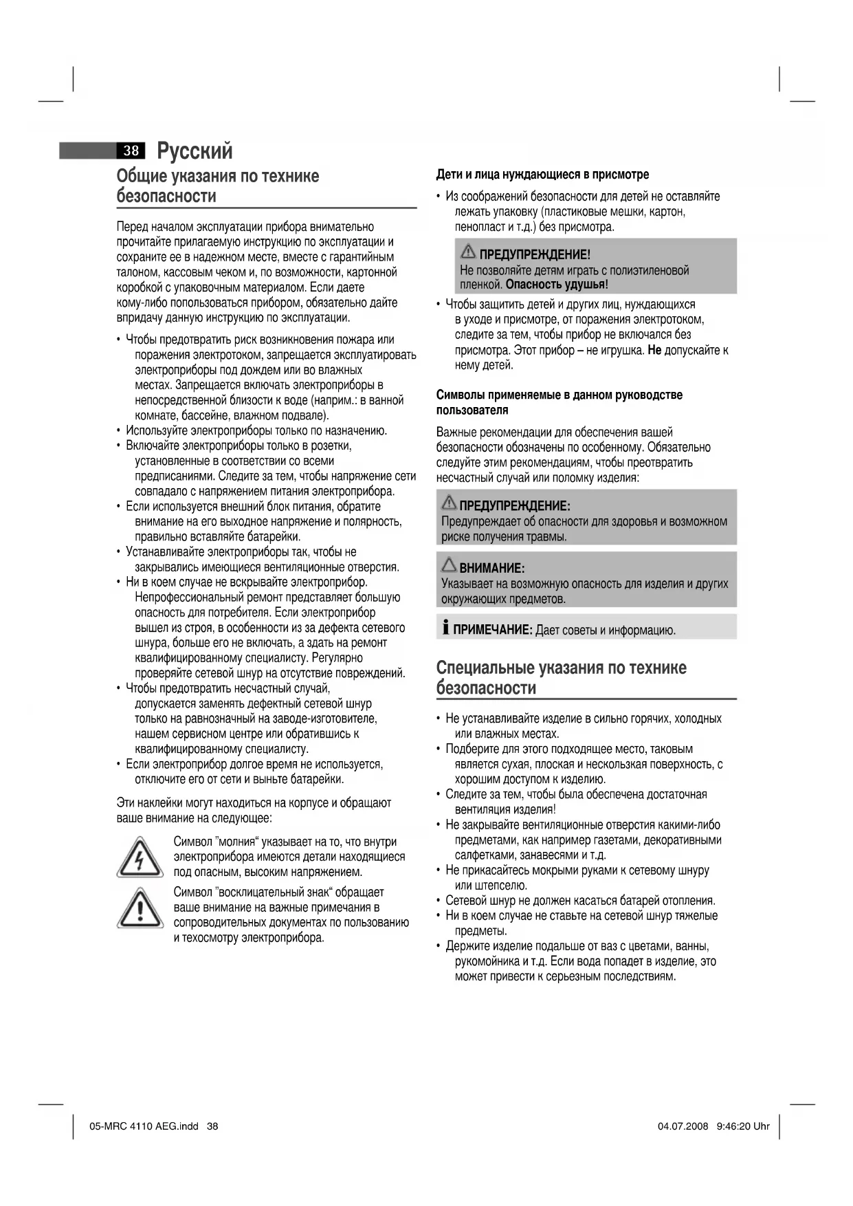 - Держите изделие подальше от ваз с цветами, ванны, рукомойника и т.д. Если вода попадет в изделие, это может привести к серьезным последствиям. 05-MRC 4110 AEG.indd 3805-MRC 4110 AEG.indd 38 04.07.2008 9:46:20 Uhr04.07.2008 9:46:20 UhrРусский