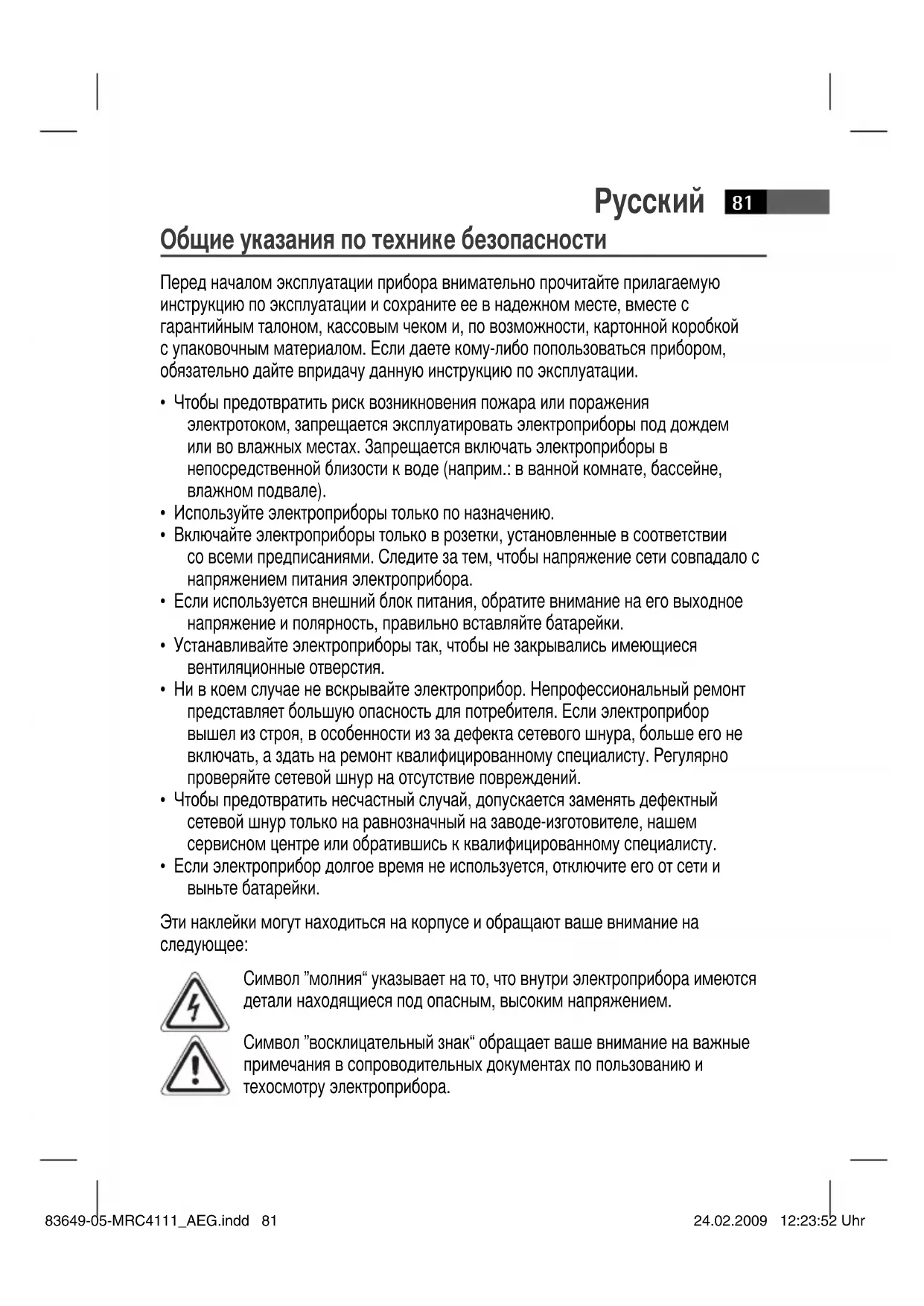 Символ ”молния“ указывает на то, что внутри электроприбора имеются детали находящиеся под опасным, высоким напряжением. Символ ”восклицательный знак“ обращает ваше внимание на важные примечания в сопроводительных документах по пользованию и техосмотру электроприбора. 83649-05-MRC4111_AEG.indd 8183649-05-MRC4111_AEG.indd 81 24.02.2009 12:23:52 Uhr24.02.2009 12:23:52 UhrРусский