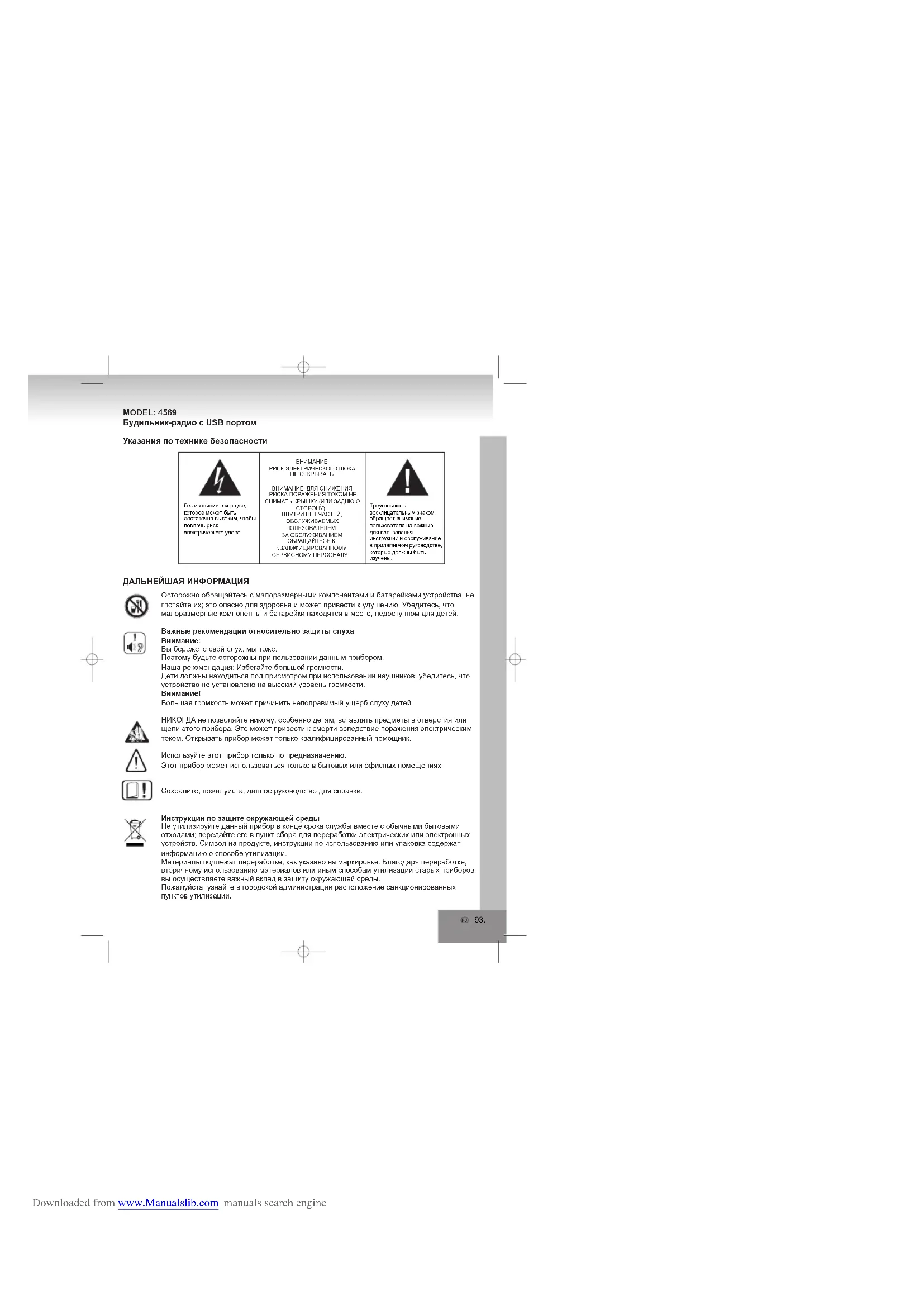 Downloaded from www.Manualslib.com manuals search engineУстранение неисправностей Если что-либо не работает, то перед тем, как нести устройство в службу ремонта, проверьте таблицу, приведенную ниже.Если Вы не можете решить проблему, следуя указанным шагам, проконсультируйтесь со своим продавцом или обратитесь в авторизованный сервисный центр.ПРЕДУПРЕЖДЕНИЕ: Никогда не открывайте прибор. Всегда обращайтесь к персоналу авторизованного бюро обслуживания по поводу ремонта или обслуживания. Проблема Причина РешениеНет звука. Установлен слишком низкий уровень громкости. Не подсоединен шнур электропитанияОтрегулируйте громкость. Вставьте шнур электропитания в настенную розетку.Плохой прием сигнала.Слабый сигнал.Помехи от других электроприборов (ТВ, видеомагнитофон, компьютер, и т.п.).Отрегулируйте положение антенны.Держите другие электроприборы на расстоянии.Не работает кнопка. Электростатический разряд.Выключите устройство, а потом снова его включите. Также можно выключить устройство, отсоединить шнур электропитания и батарейку, а потом снова подсоединить их. Техническая спецификация Электропитание: 230 В ~ 50 ГцСохранение значения времени, настроек: 9 В, пост. ток батарейка (F22 / E-Block)Частотный диапазон: FM 87,5 – 108 МГц AM 525 – 1615 кГцРазмеры: примерно 140 x 150 x 60ммВес: примерно 570 г (без батарейки)Спецификация может быть изменена без предварительного уведомления.