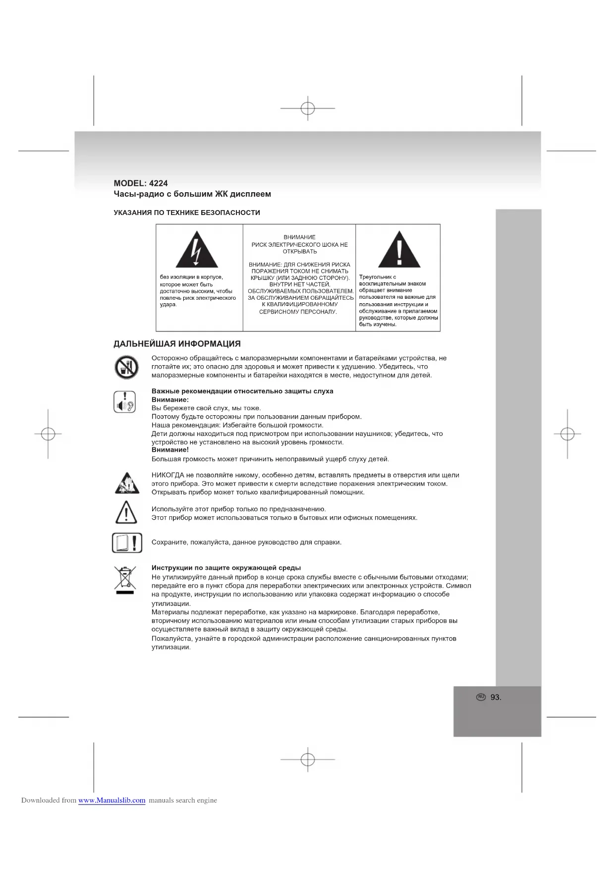 MODEL: 4224 Часы-радио с большим ЖК дисплеем УКАЗАНИЯ ПО ТЕХНИКЕ БЕЗОПАСНОСТИТреугольник с восклицательным знаком обращает внимание пользователя на важные для пользования инструкции и обслуживание в прилагаемом руководстве, которые должны быть изучены.без изоляции в корпусе, которое может быть достаточно высоким, чтобы повлечь риск электрического удара.Осторожно обращайтесь с малоразмерными компонентами и батарейками устройства, не глотайте их; это опасно для здоровья и может привести к удушению. Убедитесь, что малоразмерные компоненты и батарейки находятся в месте, недоступном для детей.Важные рекомендации относительно защиты слухаВнимание:Вы бережете свой слух, мы тоже.Поэтому будьте осторожны при пользовании данным прибором.Наша рекомендация: Избегайте большой громкости.Дети должны находиться под присмотром при использовании наушников; убедитесь, что устройство не установлено на высокий уровень громкости.Внимание!Большая громкость может причинить непоправимый ущерб слуху детей.НИКОГДА не позволяйте никому, особенно детям, вставлять предметы в отверстия или щели этого прибора. Это может привести к смерти вследствие поражения электрическим током. Открывать прибор может только квалифицированный помощник.Используйте этот прибор только по предназначению.Этот прибор может использоваться только в бытовых или офисных помещениях.Сохраните, пожалуйста, данное руководство для справки.Инструкции по защите окружающей средыНе утилизируйте данный прибор в конце срока службы вместе с обычными бытовыми отходами; передайте его в пункт сбора для переработки электрических или электронных устройств. Символ на продукте, инструкции по использованию или упаковка содержат информацию о способе утилизации.Материалы подлежат переработке, как указано на маркировке. Благодаря переработке, вторичному использованию материалов или иным способам утилизации старых приборов вы осуществляете важный вклад в защиту окружающей среды.Пожалуйста, узнайте в городской администрации расположение санкционированных пунктов утилизации. ДАЛЬНЕЙШАЯ ИНФОРМАЦИЯ ВНИМАНИЕРИСК ЭЛЕКТРИЧЕСКОГО ШОКА НЕ ОТКРЫВАТЬВНИМАНИЕ: ДЛЯ СНИЖЕНИЯ РИСКА ПОРАЖЕНИЯ ТОКОМ НЕ СНИМАТЬ КРЫШКУ (ИЛИ ЗАДНЮЮ СТОРОНУ). ВНУТРИ НЕТ ЧАСТЕЙ, ОБСЛУЖИВАЕМЫХ ПОЛЬЗОВАТЕЛЕМ. ЗА ОБСЛУЖИВАНИЕМ ОБРАЩАЙТЕСЬ К КВАЛИФИЦИРОВАННОМУ СЕРВИСНОМУ ПЕРСОНАЛУ. Downloaded from www.Manualslib.com manuals search engine94.