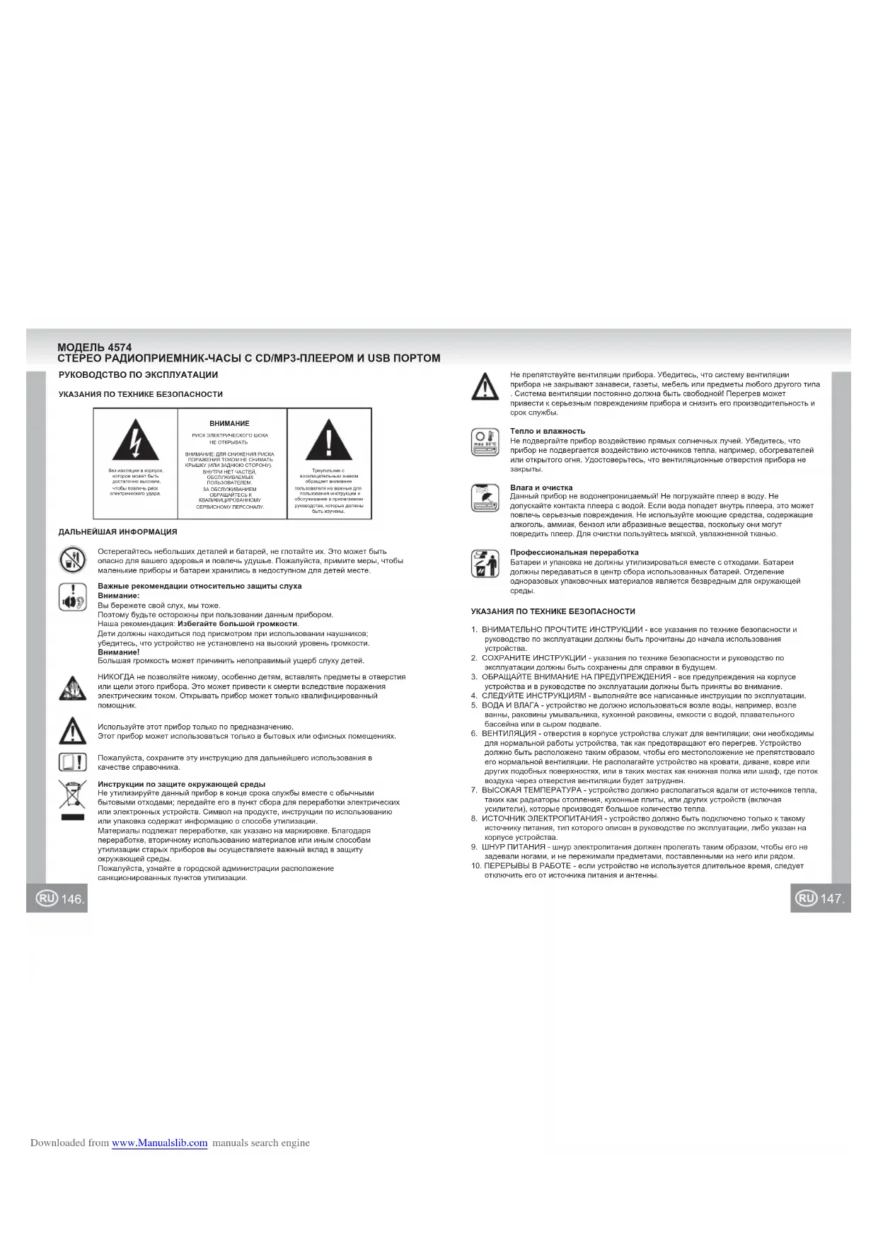 УКАЗАНИЯ ПО ТЕХНИКЕ БЕЗОПАСНОСТИ1. ВНИМАТЕЛЬНО ПРОЧТИТЕ ИНСТРУКЦИИ - все указания по технике безопасности и руководство по эксплуатации должны быть прочитаны до начала использования устройства.2. СОХРАНИТЕ ИНСТРУКЦИИ - указания по технике безопасности и руководство по эксплуатации должны быть сохранены для справки в будущем.3. ОБРАЩАЙТЕ ВНИМАНИЕ НА ПРЕДУПРЕЖДЕНИЯ - все предупреждения на корпусе устройства и в руководстве по эксплуатации должны быть приняты во внимание.4. СЛЕДУЙТЕ ИНСТРУКЦИЯМ - выполняйте все написанные инструкции по эксплуатации.5. ВОДА И ВЛАГА - устройство не должно использоваться возле воды, например, возле ванны, раковины умывальника, кухонной раковины, емкости с водой, плавательного бассейна или в сыром подвале.6. ВЕНТИЛЯЦИЯ - отверстия в корпусе устройства служат для вентиляции; они необходимы для нормальной работы устройства, так как предотвращают его перегрев. Устройство должно быть расположено таким образом, чтобы его местоположение не препятствовало его нормальной вентиляции. Не располагайте устройство на кровати, диване, ковре или других подобных поверхностях, или в таких местах как книжная полка или шкаф, где поток воздуха через отверстия вентиляции будет затруднен. 7. ВЫСОКАЯ ТЕМПЕРАТУРА - устройство должно располагаться вдали от источников тепла, таких как радиаторы отопления, кухонные плиты, или других устройств (включая усилители), которые производят большое количество тепла.8. ИСТОЧНИК ЭЛЕКТРОПИТАНИЯ - устройство должно быть подключено только к такому источнику питания, тип которого описан в руководстве по эксплуатации, либо указан на корпусе устройства.9. ШНУР ПИТАНИЯ - шнур электропитания должен пролегать таким образом, чтобы его не задевали ногами, и не пережимали предметами, поставленными на него или рядом.10. ПЕРЕРЫВЫ В РАБОТЕ - если устройство не используется длительное время, следует отключить его от источника питания и антенны.без изоляции в корпусе, которое может быть достаточно высоким, чтобы повлечь риск электрического удара.Треугольник с восклицательным знаком обращает внимание пользователя на важные для пользования инструкции и обслуживание в прилагаемом руководстве, которые должны быть изучены.ВНИМАНИЕРИСК ЭЛЕКТРИЧЕСКОГО ШОКАНЕ ОТКРЫВАТЬВНИМАНИЕ: ДЛЯ СНИЖЕНИЯ РИСКА ПОРАЖЕНИЯ ТОКОМ НЕ СНИМАТЬ КРЫШКУ (ИЛИ ЗАДНЮЮ СТОРОНУ).ВНУТРИ НЕТ ЧАСТЕЙ, ОБСЛУЖИВАЕМЫХ ПОЛЬЗОВАТЕЛЕМ.ЗА ОБСЛУЖИВАНИЕМ ОБРАЩАЙТЕСЬ К КВАЛИФИЦИРОВАННОМУ СЕРВИСНОМУ ПЕРСОНАЛУ.МОДЕЛЬ 4574СТЕРЕО РАДИОПРИЕМНИК-ЧАСЫ С CD/MP3-ПЛЕЕРОМ И USB ПОРТОМНе препятствуйте вентиляции прибора. Убедитесь, что систему вентиляции прибора не закрывают занавеси, газеты, мебель или предметы любого другого типа. Система вентиляции постоянно должна быть свободной! Перегрев может привести к серьезным повреждениям прибора и снизить его производительность и срок службы.Пожалуйста, сохраните эту инструкцию для дальнейшего использования в качестве справочника.Инструкции по защите окружающей средыНе утилизируйте данный прибор в конце срока службы вместе с обычными бытовыми отходами; передайте его в пункт сбора для переработки электрических или электронных устройств. Символ на продукте, инструкции по использованию или упаковка содержат информацию о способе утилизации.Материалы подлежат переработке, как указано на маркировке. Б