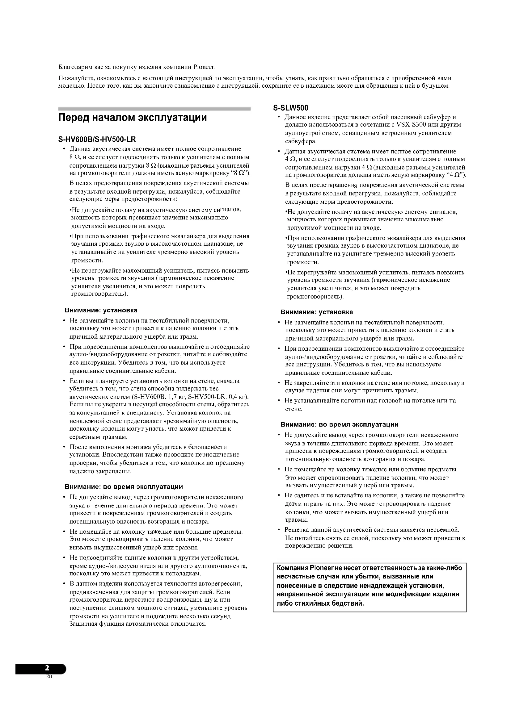 - Решетка данной акустической системы является несъемной. Не пытайтесь снять ее силой, поскольку это может привести к повреждению решетки. Компания Pioneer не несет ответственность за какие-либо несчастные случаи или убытки, вызванные или понесенные в следствие ненадлежащей установки, неправильной эксплуатации или модификации изделия либо стихийных бедствий. S-HV600B_S-HV500-LR_En.fm 2 ページ 2011年4月12日 火曜日 午後8時11分3