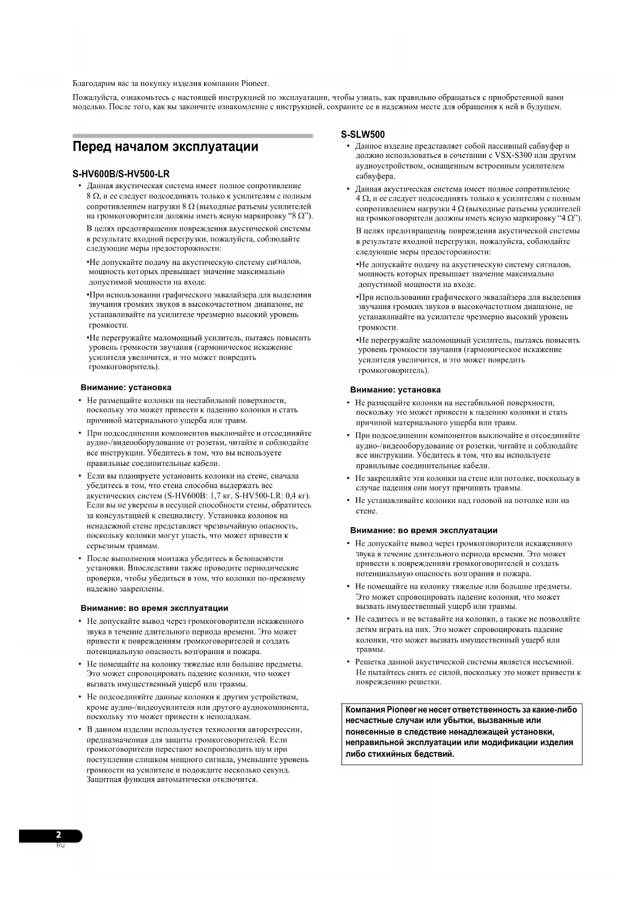 Благодарим вас за покупку изделия компании Pioneer. Пожалуйста, ознакомьтесь с настоящей инструкцией по эксплуатации, чтобы узнать, как правильно обращаться с приобретенной вами моделью. После того, как вы закончите ознакомление с инструкцией, сохраните ее в надежном месте для обращения к ней в будущем. Перед началом эксплуатации S-HV600B/S-HV500-LR