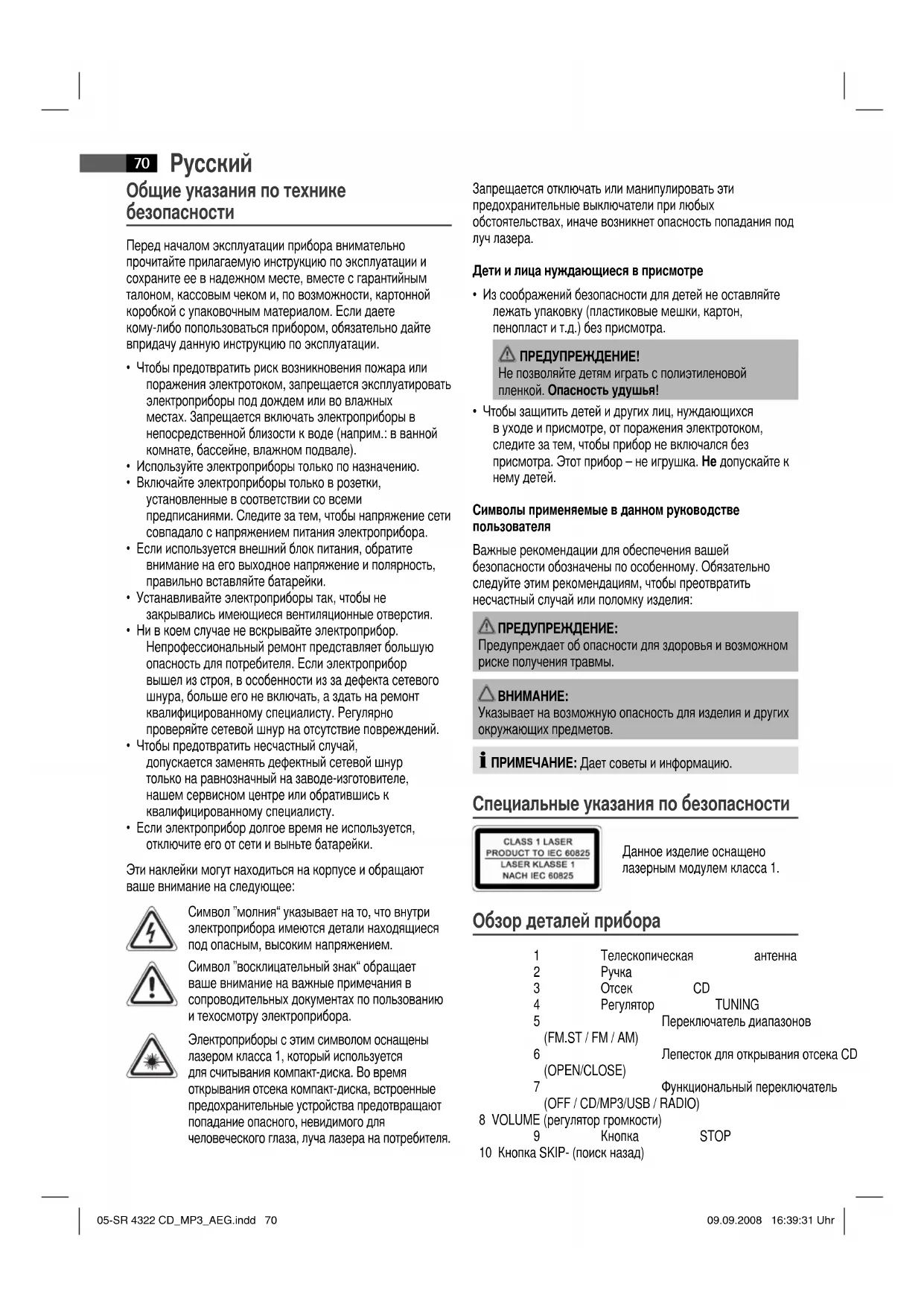 Указывает на возможную опасность для изделия и других окружающих предметов. ПРИМЕЧАНИЕ: Дает советы и информацию. Специальные указания по безопасности Данное изделие оснащено лазерным модулем класса 1. Обзор деталей прибора 1 Телескопическая антенна 2 Ручка 3 Отсек CD 4 Регулятор TUNING 5 Переключатель диапазонов (FM.ST / FM / AM) 6 Лепесток для открывания отсека CD (OPEN/CLOSE) 7 Функциональный переключатель (OFF / CD/MP3/USB / RADIO) 8 VOLUME (регулятор громкости) 9 Кнопка STOP 10 Кнопка SKIP- (поиск назад) 05-SR 4322 CD_MP3_AEG.indd 7005-SR 4322 CD_MP3_AEG.indd 70 09.09.2008 16:39:31 Uhr09.09.2008 16:39:31 UhrРусский