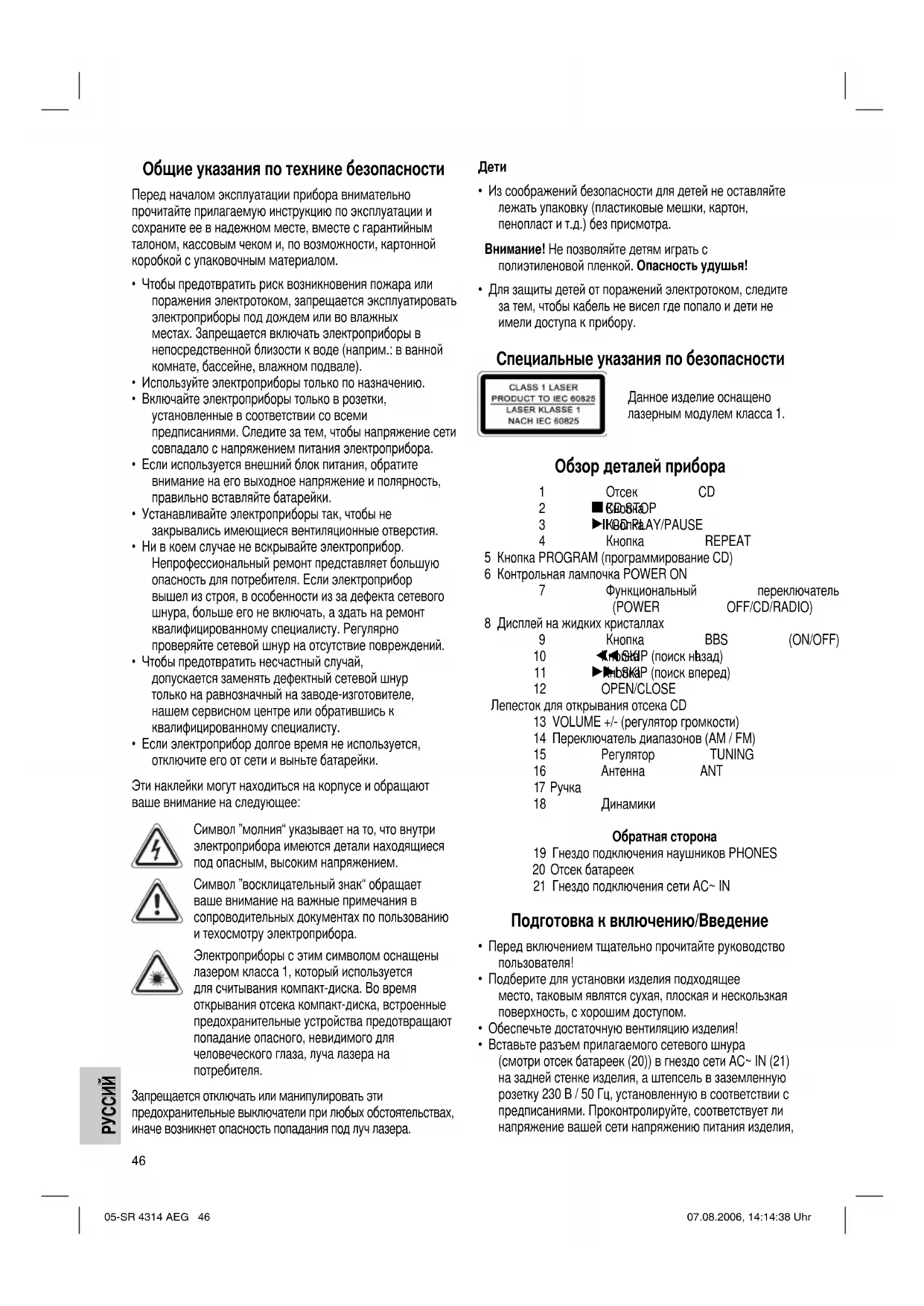 - Вставьте разъем прилагаемого сетевого шнура (смотри отсек батареек (20)) в гнездо сети AC~ IN (21) на задней стенке изделия, а штепсель в заземленную розетку 230 В / 50 Гц, установленную в соответствии с предписаниями. Проконтролируйте, соответствует ли напряжение вашей сети напряжению питания изделия, 05-SR 4314 AEG 46 07.08.2006, 14:14:38 UhrРУССИЙ