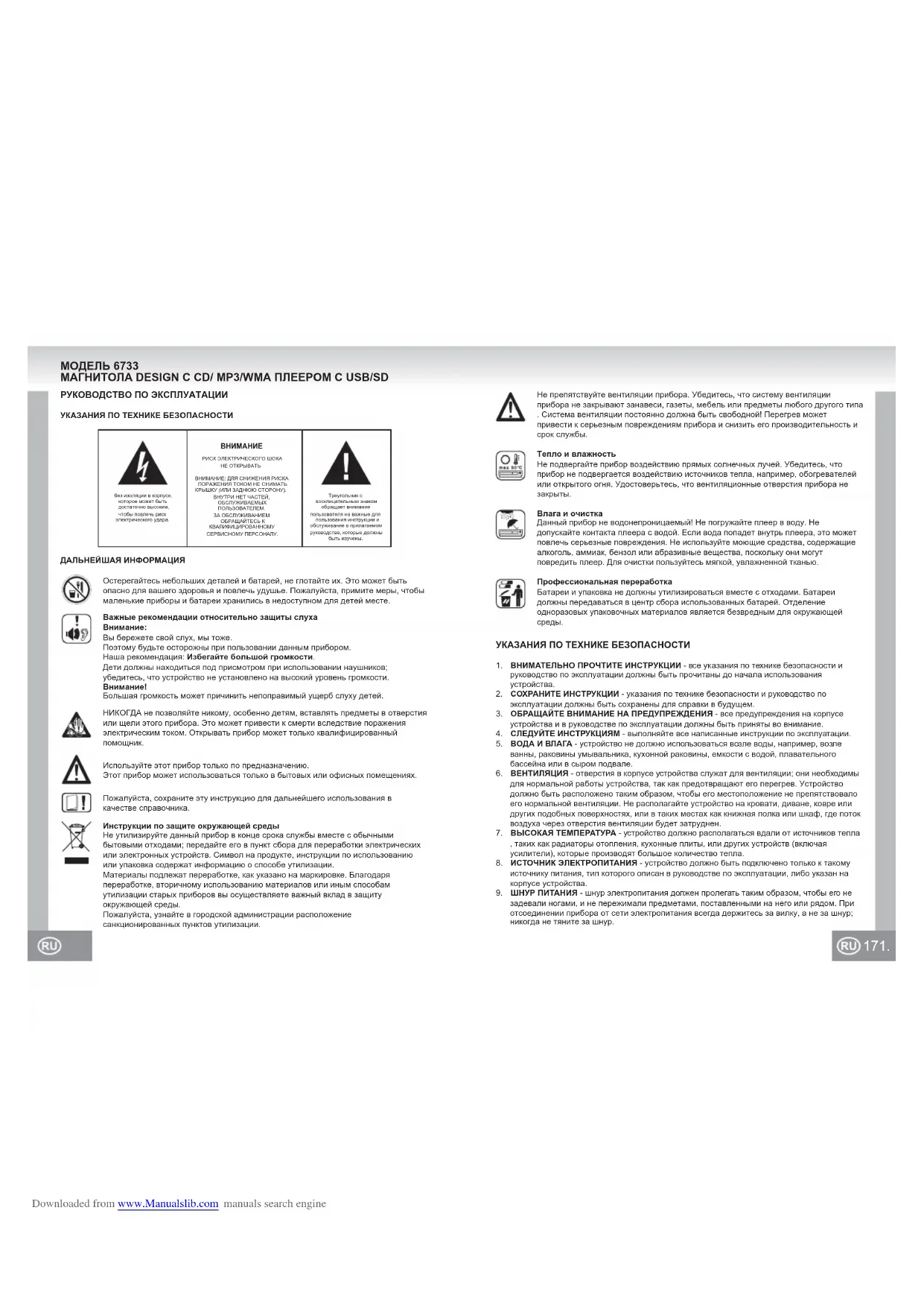 Не препятствуйте вентиляции прибора. Убедитесь, что систему вентиляции прибора не закрывают занавеси, газеты, мебель или предметы любого другого типа. Система вентиляции постоянно должна быть свободной! Перегрев может привести к серьезным повреждениям прибора и снизить его производительность и срок службы.Пожалуйста, сохраните эту инструкцию для дальнейшего использования в качестве справочника.Инструкции по защите окружающей средыНе утилизируйте данный прибор в конце срока службы вместе с обычными бытовыми отходами; передайте его в пункт сбора для переработки электрических или электронных устройств. Символ на продукте, инструкции по использованию или упаковка содержат информацию о способе утилизации.Материалы подлежат переработке, как указано на маркировке. Благодаря переработке, вторичному использованию материалов или иным способам утилизации старых приборов вы осуществляете важный вклад в защиту окружающей среды.Пожалуйста, узнайте в городской администрации расположение санкционированных пунктов утилизации.Тепло и влажностьНе подвергайте прибор воздействию прямых солнечных лучей. Убедитесь, что прибор не подвергается воздействию источников тепла, например, обогревателей или открытого огня. Удостоверьтесь, что вентиляционные отверстия прибора не закрыты.Влага и очисткаДанный прибор не водонепроницаемый! Не погружайте плеер в воду. Не допускайте контакта плеера с водой. Если вода попадет внутрь плеера, это может повлечь серьезные повреждения. Не используйте моющие средства, содержащие алкоголь, аммиак, бензол или абразивные вещества, поскольку они могут повредить плеер. Для очистки пользуйтесь мягкой, увлажненной тканью.НИКОГДА не позволяйте никому, особенно детям, вставлять предметы в отверстия или щели этого прибора. Это может привести к смерти вследствие поражения электрическим током. Открывать прибор может только квалифицированный помощник.Остерегайтесь небольших деталей и батарей, не глотайте их. Это может быть опасно для вашего здоровья и повлечь удушье. Пожалуйста, примите меры, чтобы маленькие приборы и батареи хранились в недоступном для детей месте.Важные рекомендации относительно защиты слухаВнимание:Вы бережете свой слух, мы тоже.Поэтому будьте осторожны при пользовании данным прибором.Наша рекомендация: Избегайте большой громкости.Дети должны находиться под присмотром при использовании наушников; убедитесь, что устройство не установлено на высокий уровень громкости.Внимание!Большая громкость может причинить непоправимый ущерб слуху детей.Используйте этот прибор только по предназначению.Этот прибор может использоваться только в бытовых или офисных помещениях.Профессиональная переработкаБатареи и упаковка не должны утилизироваться вместе с отходами. Батареи должны передаваться в центр сбора использованных батарей. Отделение одноразовых упаковочных материалов является безвредным для окружающей среды.РУКОВОДСТВО ПО ЭКСПЛУАТАЦИИУКАЗАНИЯ ПО ТЕХНИКЕ БЕЗОПАСНОСТИДАЛЬНЕЙШАЯ ИНФОРМАЦИЯ Downloaded from www.Manualslib.com manuals search engine173. 172.