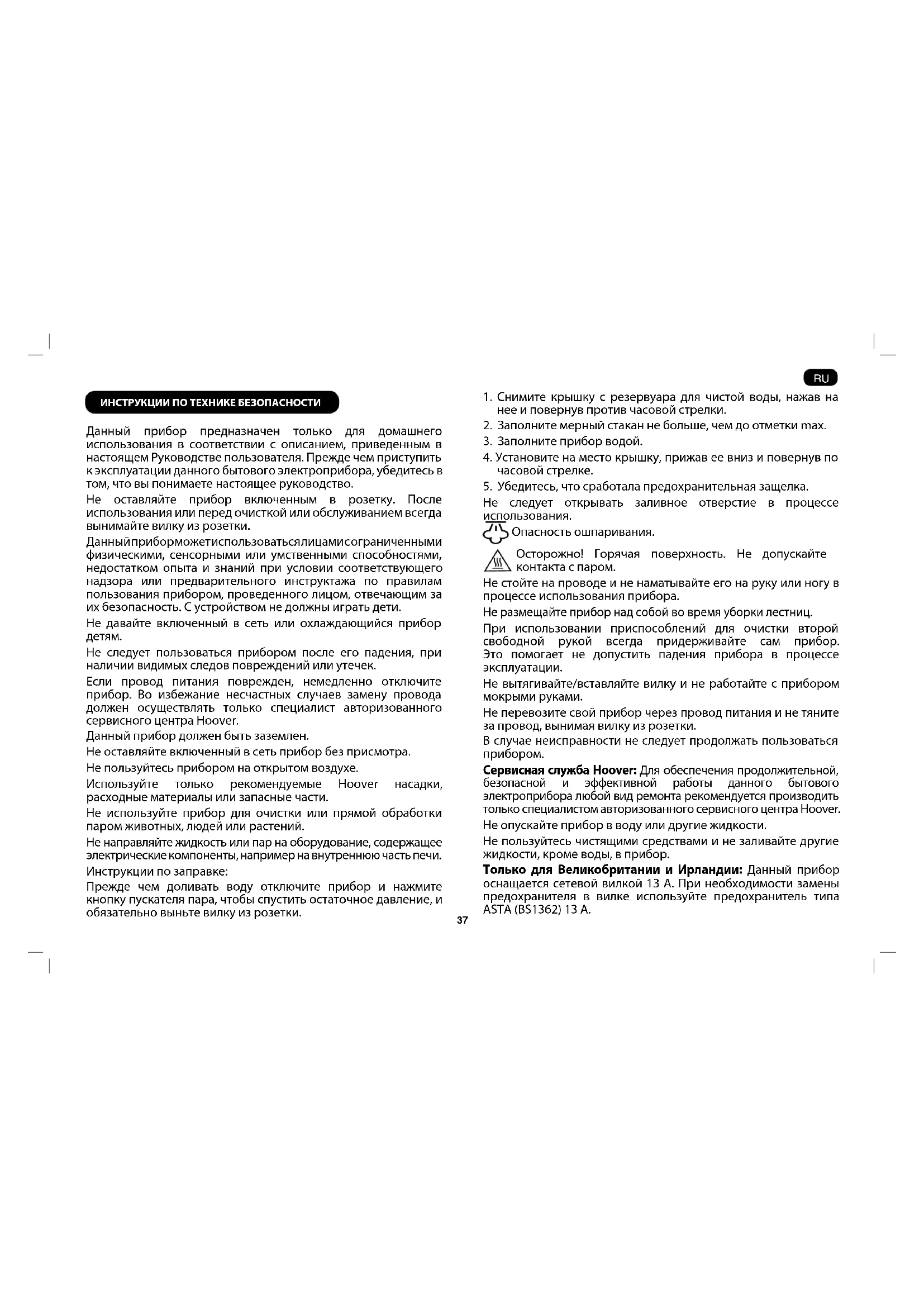 Не следует пользоваться прибором после его падения, при наличии видимых следов повреждений или утечек. Если провод питания поврежден, немедленно отключите прибор. Во избежание несчастных случаев замену провода должен осуществлять только специалист авторизованного сервисного центра Hoover. Данный прибор должен быть заземлен. Не оставляйте включенный в сеть прибор без присмотра. Не пользуйтесь прибором на открытом воздухе. Используйте только рекомендуемые Hoover насадки, расходные материалы или запасные части. Не используйте прибор для очистки или прямой обработки паром животных, людей или растений. Не направляйте жидкость или пар на оборудование, содержащее электрические компоненты, например на внутреннюю часть печи. Инструкции по заправке: Прежде чем доливать воду отключите прибор и нажмите кнопку пускателя пара, чтобы спустить остаточное давление, и обязательно выньте вилку из розетки.