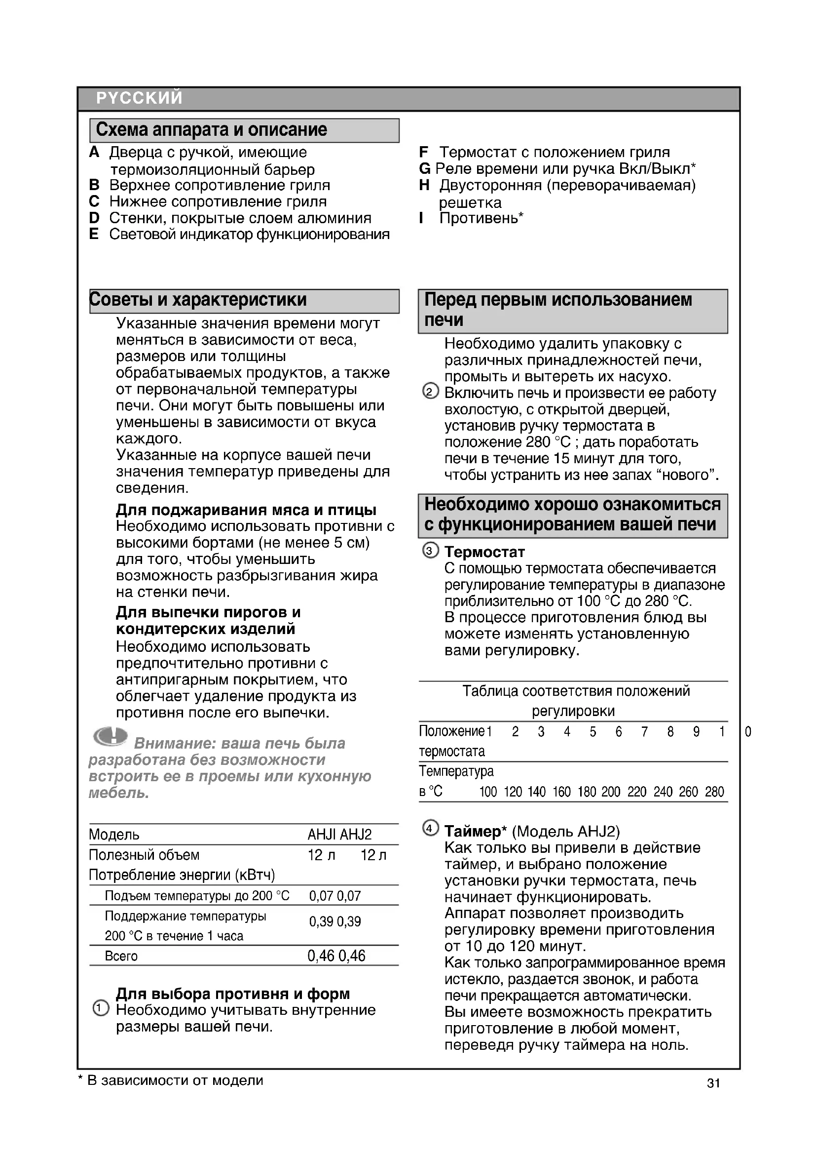 Таймер* (Модель АНJ2) Как только вы привели в действие таймер, и выбрано положение установки ручки термостата, печь начинает функционировать. Аппарат позволяет производить регулировку времени приготовления от 10 до 120 минут. Как только запрограммированное время истекло, раздается звонок, и работа печи прекращается автоматически. Вы имеете возможность прекратить приготовление в любой момент, переведя ручку таймера на ноль.
