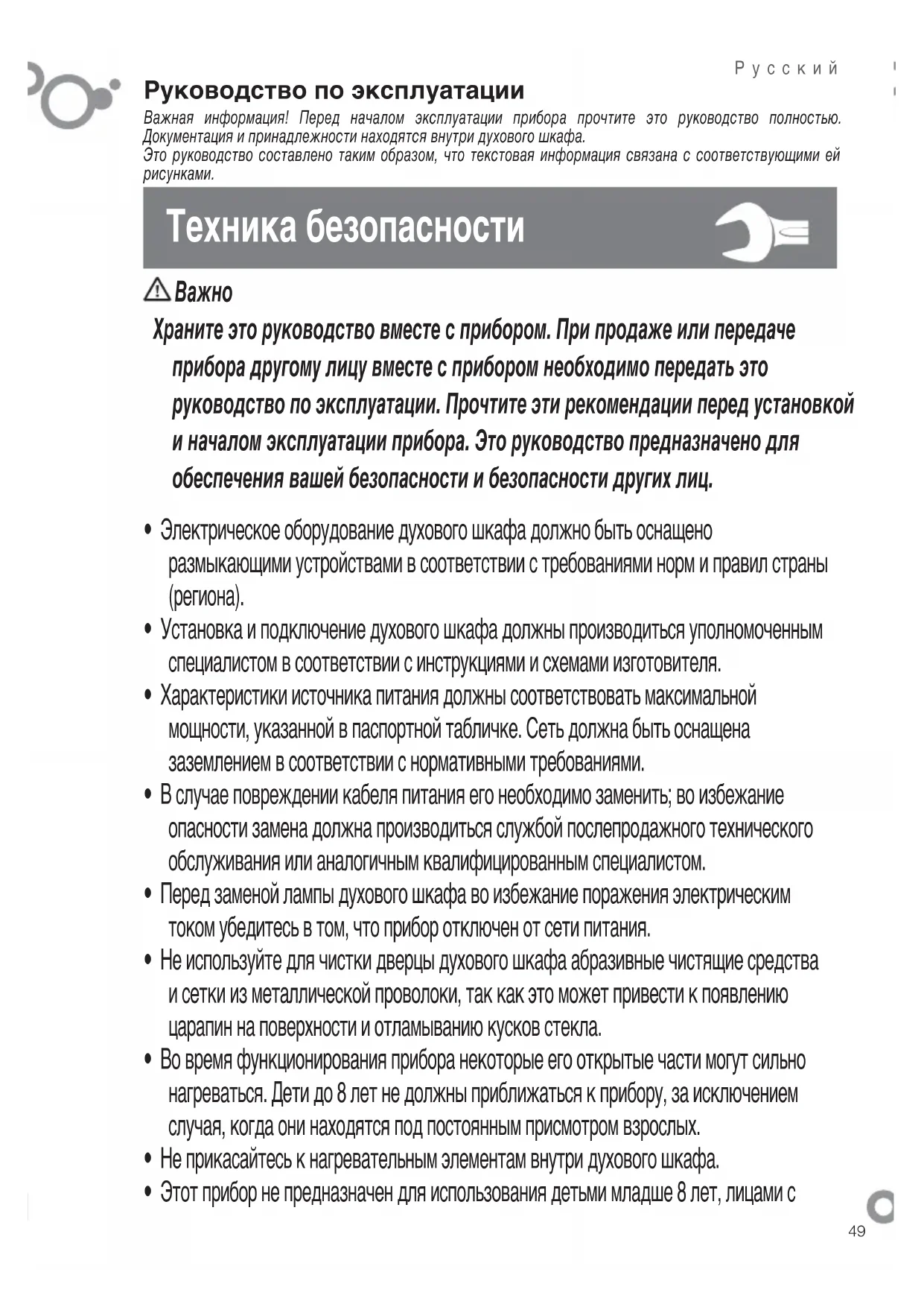 Храните это руководство вместе с прибором. При продаже или передаче прибора другому лицу вместе с прибором необходимо передать это руководство по эксплуатации. Прочтите эти рекомендации перед установкой и началом эксплуатации прибора. Это руководство предназначено для обеспечения вашей безопасности и безопасности других лиц.50