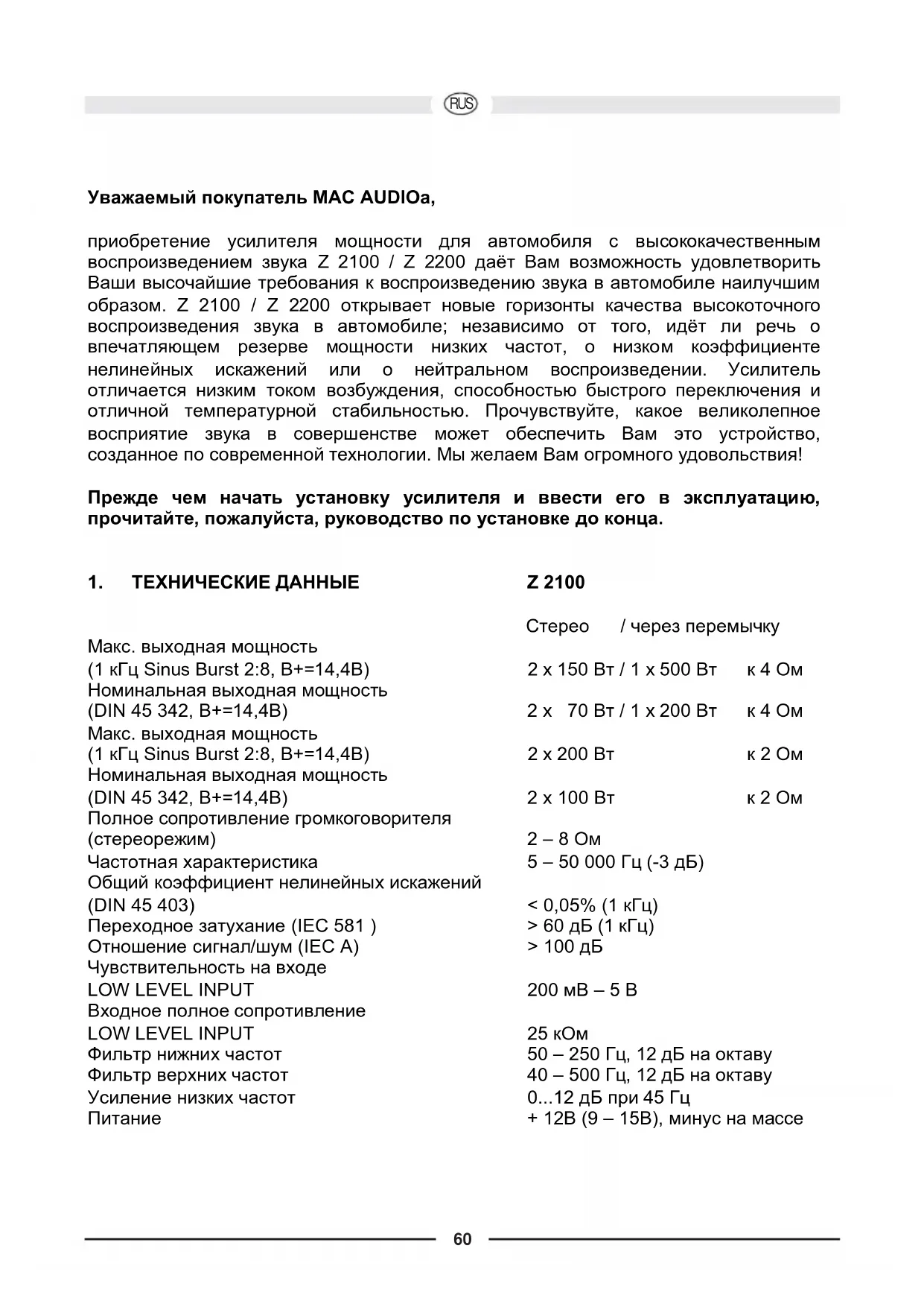 РУКОВОДСТВО ПОЛЬЗОВАТЕЛЯ Z 2100 MAC AUDIO
