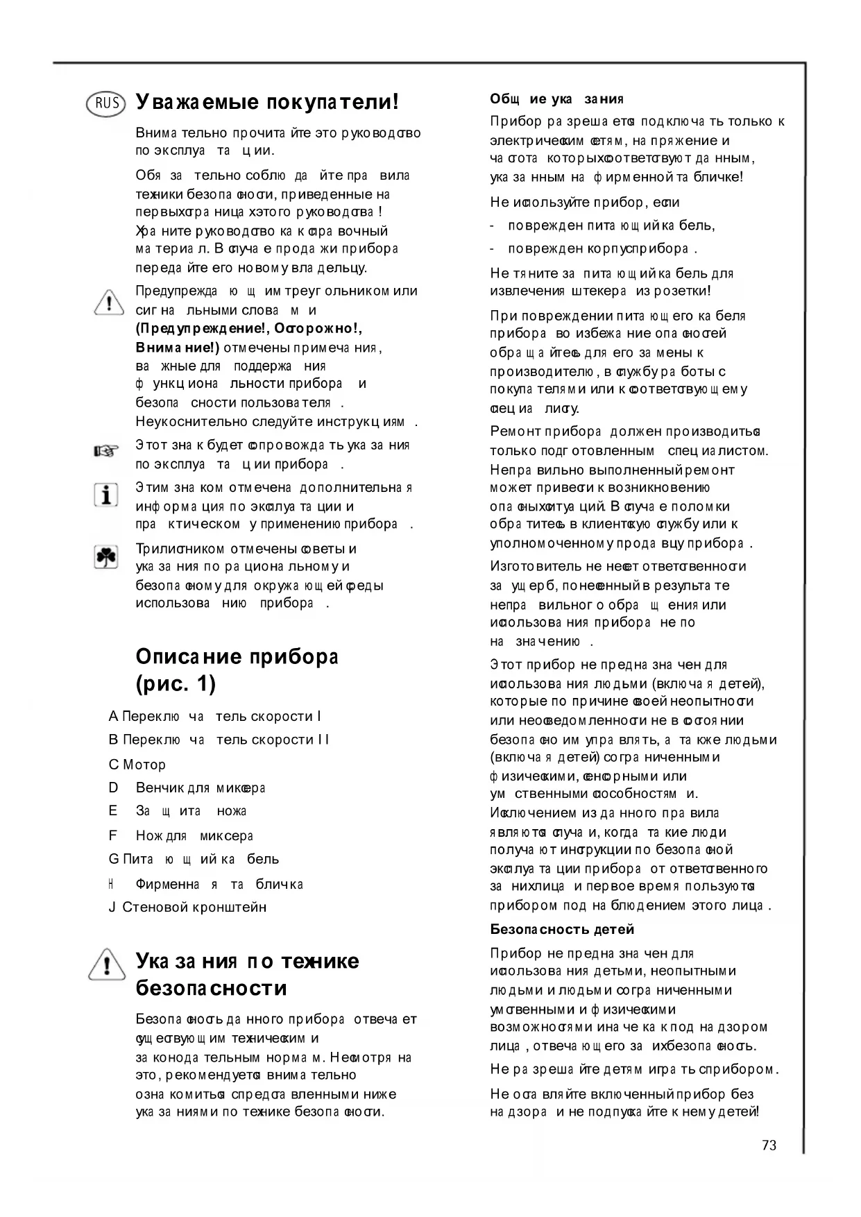 - Κανονισµός EMC 89 /336/EEC συµπ εριλ. τροπ οποίη ση 9 2/31/EEC και 9 3/68/EEC73 Уважаемые покупатели! Внимательно прочита йте это руководство по эксплуа та ции. Обя за тельно соблю да йте пра вила техники безопа сности, приведенные на первых страница х этого руководства ! Хра ните руководство ка к спра вочный ма териал. В случа е прода жи прибора переда йте его новом у вла дельцу. Предупрежда ю щ им треугольником или сигна льными слова м и (Предупреждение!, Осторожно!, Внимание!) отмечены примеча ния, ва жные для поддержа ния ф ункциона льности прибора и безопа сности пользователя . Неукоснительно следуйте инструкциям . Этот зна к будет сопровожда ть ука за ния по эксплуа та ции прибора . Этим зна ком отм ечена дополнительна я инф орма ция по эксплуа та ции и пра ктическом у применению прибора . Трилистником отмечены советы и ука за ния по ра циона льном у и безопа сном у для окружа ю щ ей среды использова нию прибора . Описание прибора (рис. 1) A Переклю ча тель скорости I B Переклю ча тель скорости II C Мотор D Венчик для миксера E За щ ита ножа F Нож для миксера G Пита ю щ ий ка бель H Фирменна я та бличка J Стеновой кронштейн Указания по технике безопасности Безопа сность да нного прибора отвеча ет сущ ествую щ им техническим и за конода тельным норма м. Несмотря на это, рекомендуется вним а тельно озна комиться с предста вленными ниже ука за ниям и по технике безопа сности. Общ ие ука зания