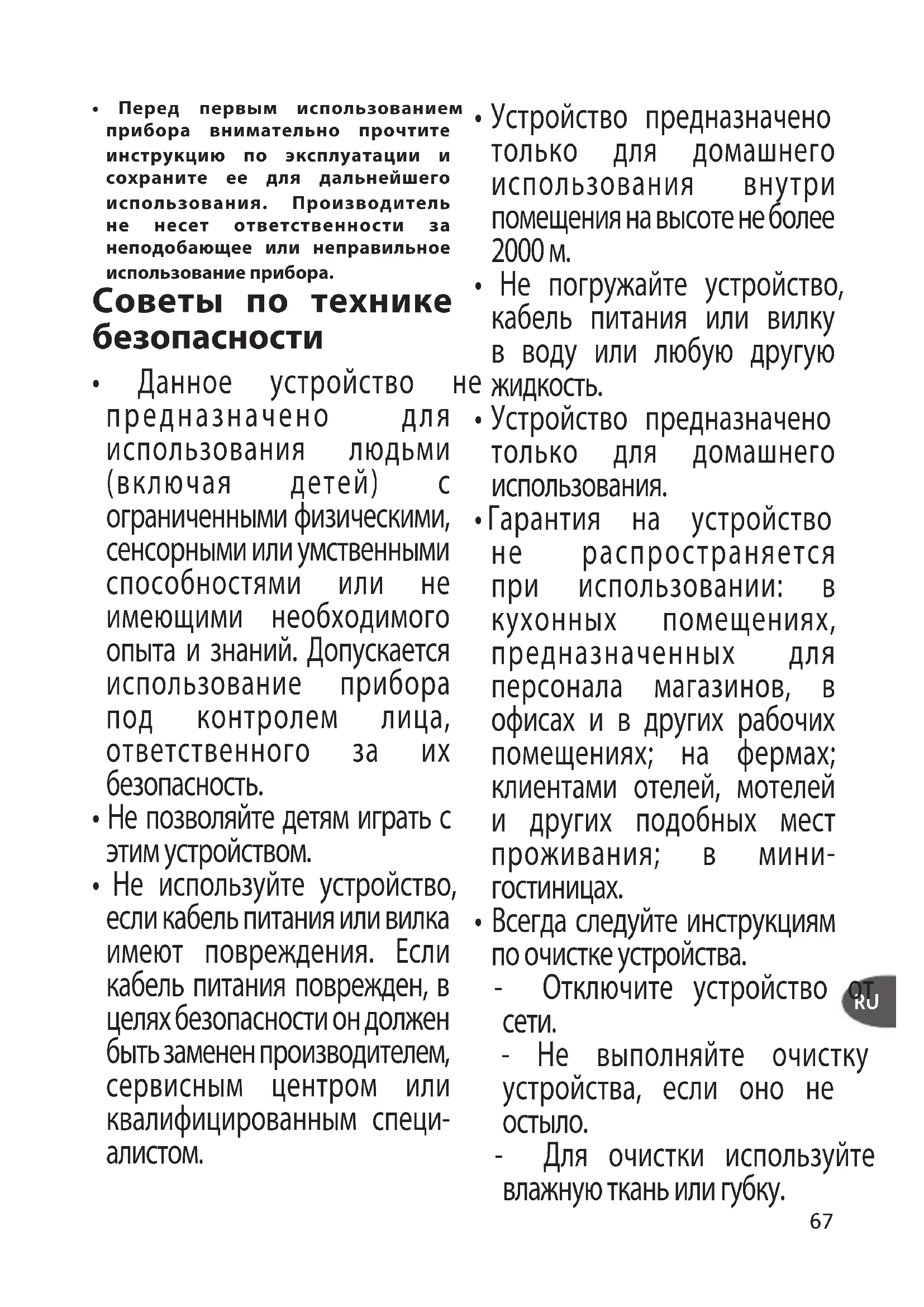 - Перед первым использованием прибора внимательно прочтите инструкцию по эксплуатации и сохраните ее для дальнейшего использования. Производитель не несет ответственности за неподобающее или неправильное использование прибора. Советы по технике безопасности