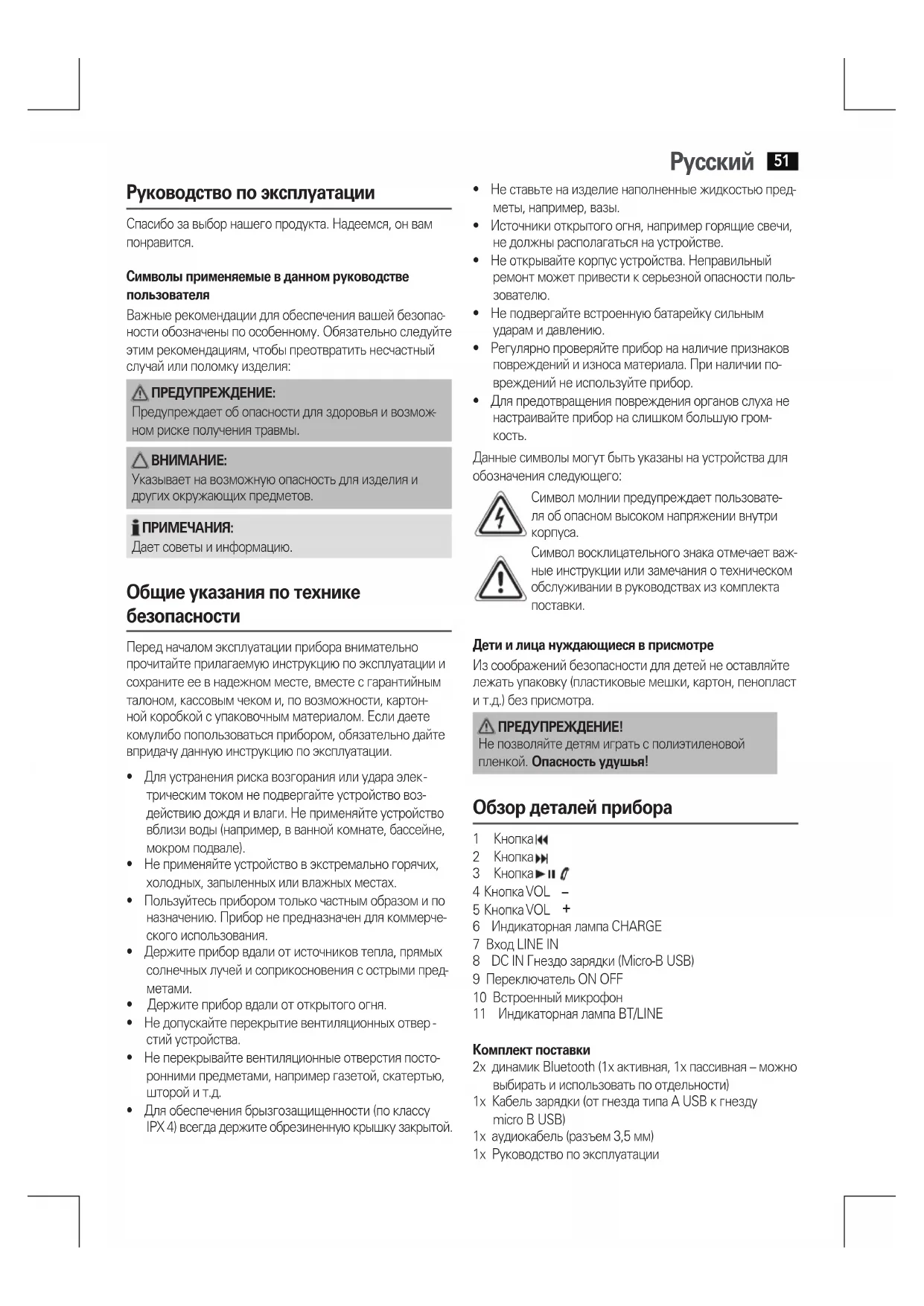 6 ИндикаторнаялампаCHARGE 7 Вход LINE IN 8 DCINГнездозарядки(Micro-BUSB) 9 Переключатель ON OFF 10 Встроенный микрофон 11 ИндикаторнаялампаBT/LINE Комплект поставки 2x динамик Bluetooth (1x активная, 1x пассивная – можно выбирать и использовать по отдельности) 1x Кабель зарядки (от гнезда типа A USB к гнезду micro B USB) 1x аудиокабель (разъем 3,5 мм) 1x Руководство по эксплуатацииРусский