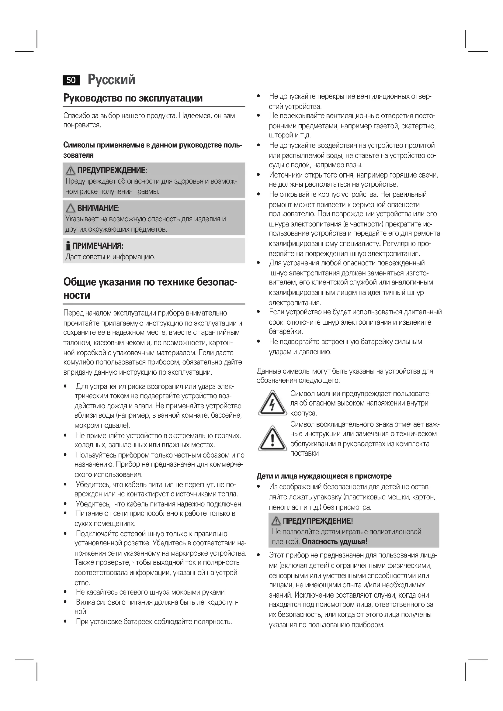 Руководство по эксплуатации Спасибо за выбор нашего продукта. Надеемся, он вам понравится. Символы применяемые в данном руководстве поль-