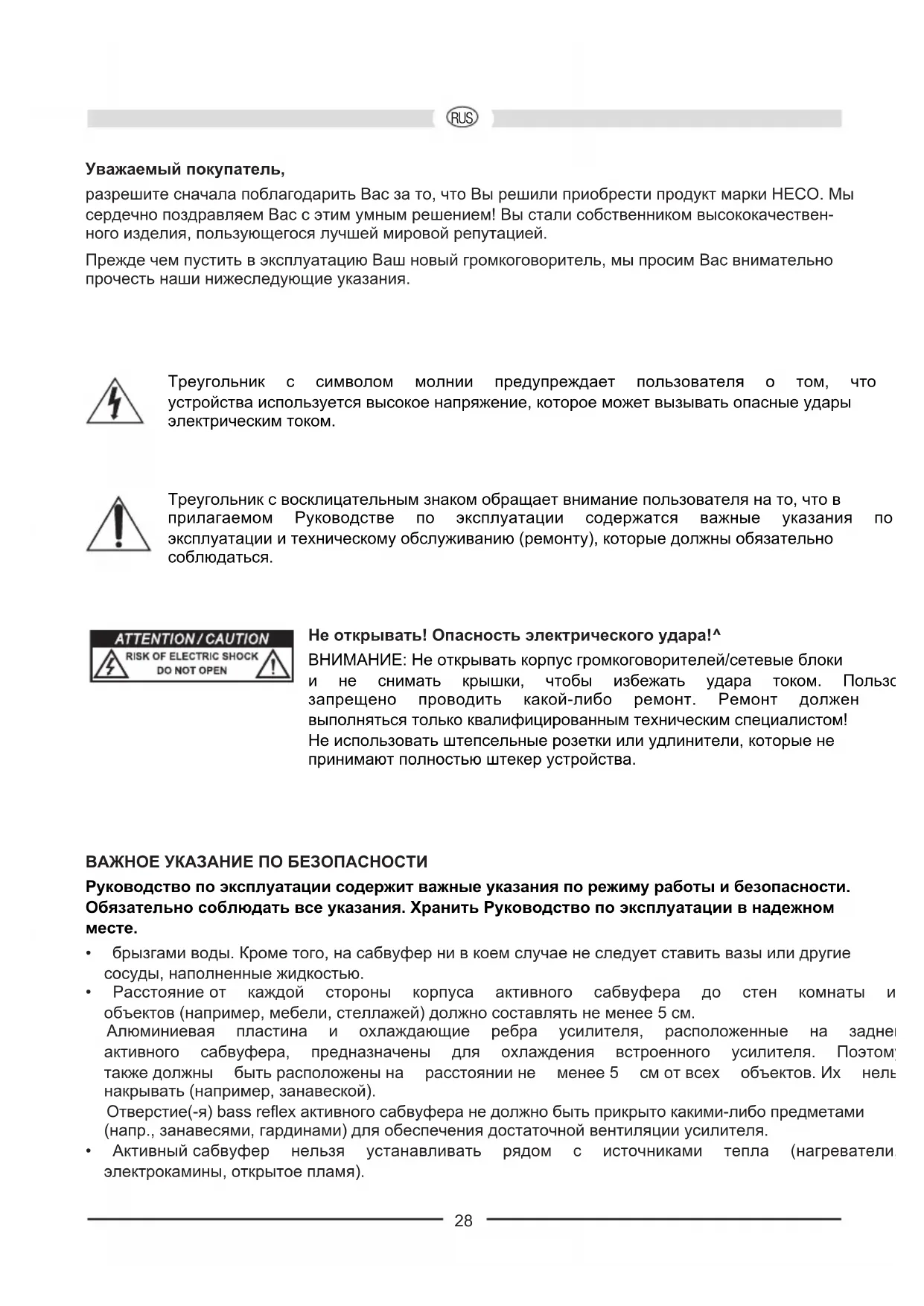 OBS! Vid anslutning till subwoofer-utgången på en AV-mottagare bör subwoofernivån ha ställts på 0 dB i mottaragens setup. Delningsfrekvensreglering (8) Härmed bör du ställa in den högsta frekvensen som subwoofern kan arbeta med. I kombination med hyllhögtalare bör frekvensen ställas in på 100 Hz - 150 Hz, om stående högtalare används kan en inställning mellan 50 Hz - 100 Hz rekommenderas. Fasreglering (9) I normalfall ska fasregleringen stå på 0°. I vissa fall kan det vara lämpligt att variera fasen mellan 0° och 360° (t ex vid långt avstånd mellan subwoofern och front-satelliterna eller vid dålig akustik i rummet). Generellt gäller: Fasomkopplaren står i rätt läge när grundtonen låter mest naturlig. SKÖTSEL Rengör helst de lackerade ytorna med ett milt hushållsrengöringsmedel, använd alltså aldrig möbelpolish eller liknande. TEKNISKA DATA Konfiguration: Aktiv subwoofer Bestyckning: 20 cm woofer, 2 x 20 cm bass-radiator Utgångseffekt RMS/Max.: 325 / 650 W Frekvensområde: 22 – 200 Hz Delningsfrekvens: 50 – 200 Hz inställbar Mått (BxHxD): 238 x 245 x 270 mm Tillbehör: Nätkabel VI FÖRBEHÅLLER OSS RÄTTEN TILL TEKNISKA ÄNDRINGAR.28 RUS Уважаемый покупатель, разрешитесначалапоблагодаритьВасзато,чтоВырешилиприобрестипродуктмаркиHECO.Мы сердечнопоздравляемВассэтимумнымрешением!Высталисобственникомвысококачествен- ногоизделия,пользующегосялучшеймировойрепутацией. ПреждечемпуститьвэксплуатациюВашновыйгромкоговоритель,мыпросимВасвнимательно прочестьнашинижеследующиеуказания. Треугольник с символом молнии предупреждает пользователя о том, что внутри устройстваиспользуетсявысокоенапряжение,котороеможетвызыватьопасныеудары электрическимтоком. Треугольниксвосклицательнымзнакомобращаетвниманиепользователянато,чтов прилагаемом Руководстве по эксплуатации содержатся важные указания по эксплуатацииитехническомуобслуживанию(ремонту),которыедолжныобязательно соблюдаться. Не открывать! Опасность электрического удара!^ ВНИМАНИЕ:Неоткрыватькорпусгромкоговорителей/сетевыеблоки и не снимать крышки, чтобы избежать удара током. Пользователю запрещено проводить какой-либо ремонт. Ремонт должен выполнятьсятолькоквалифицированнымтехническимспециалистом! Неиспользоватьштепсельныерозеткиилиудлинители,которыене принимаютполностьюштекерустройства. ВАЖНОЕ УКАЗАНИЕ ПО БЕЗОПАСНОСТИ Руководство по эксплуатации содержит важные указания по режиму работы и безопасности. Обязательно соблюдать все указания. Хранить Руководство по эксплуатации в надежном