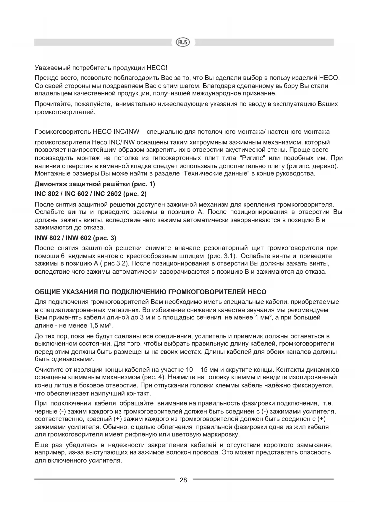 Max belastning 120 / 200 W 100 / 180 W 100 / 180 W Impedans 4 – 8 ohm 4 – 8 ohm 2 x 4 ohm Brytfrekvens: 3500 Hz 3500 Hz 3600 Hz Frekvensområde 32 – 32 000 Hz 35 – 32 000 Hz 35 – 30 000 Hz Rekommenderad förstärkareffekt 30 – 180 W 30 – 140 W 30 – 160 W Verkningsgrad (1 W/1 m) 91 dB 90 dB 90 dB Yttermått Ø: 272 mm 231 mm 231 mm Öppning Ø: 242 mm 198 mm 198 mm Monteringsdjup: 112 mm 98 mm 92 mm INW 802 INW 602 Max belastning 120 / 200 W 100 / 180 W Impedans 4 ohm 4 – 8 ohm Brytfrekvens: 3500 Hz 3500 Hz Frekvensområde 32 – 32 000 Hz 38 – 32 000 Hz Rekommenderad förstärkareffekt 30 – 180 W 30 – 160 W Verkningsgrad (1 W/1 m) 91 dB 90 dB Yttermått (B x H): 253 x 356 mm 219 x 306 mm Öppning (B x H): 223 x 325 mm 188 x 274 mm Monteringsdjup: 90 mm 75 mm VI FÖRBEHÅLLER OSS RÄTTEN TILL TEKNISKA ÄNDRINGAR. 27Уважаемый потребитель продукции HECO! Прежде всего, позвольте поблагодарить Вас за то, что Вы сделали выбор в пользу изделий HECO. Со своей стороны мы поздравляем Вас с этим шагом. Благодаря сделанному выбору Вы стали владельцем качественной продукции, получившей международное признание. Прочитайте, пожалуйста, внимательно нижеследующие указания по вводу в эксплуатацию Ваших громкоговорителей. Громкоговоритель HECO INC/INW – специально для потолочного монтажа/ настенного монтажа громкоговорители Heco INC/INW оснащены таким хитроумным зажимным механизмом, который позволяет наипростейшим образом закрепить их в отверстии акустической стены. Проще всего производить монтаж на потолке из гипсокартонных плит типа “Ригипс“ или подобных им. При наличии отверстия в каменной кладке следует использвать дополнительно плиту (ригипс, дерево). Монтажные размеры Вы може найти в разделе “Технические данные” в конце руководства. Демонтаж защитной решётки (рис. 1) INC 802 / INC 602 / INC 2602 (рис. 2) После снятия защитной решетки доступен зажимной механизм для крепления громкоговорителя. Ослабьте винты и приведите зажимы в позицию A. После позиционирования в отверстии Вы должны зажать винты, вследствие чего зажимы автоматически заворачиваются в позицию B и зажимаются до отказа. INW 802 / INW 602 (рис. 3) После снятия защитной решетки снимите вначале резонаторный щит громкоговорителя при помощи 6 видимых винтов с крестообразным шлицем (рис. 3.1). Ослабьте винты и приведите зажимы в позицию A ( рис 3.2). После позиционирования в отверстии Вы должны зажать винты, вследствие чего зажимы автоматически заворачиваются в позицию B и зажимаются до отказа. ОБЩИЕ УКАЗАНИЯ ПО ПОДКЛЮЧЕНИЮ ГРОМКОГОВОРИТЕЛЕЙ HECO Для подключения громкоговорителей Вам необходимо иметь специальные кабели, приобретаемые в специализированных магазинах. Во избежание снижения качества звучания мы рекомендуем Вам применять кабели длиной до 3 м и с площадью сечения не менее 1 мм², а при большей длине - не менее 1,5 мм². До тех пор, пока не будут сделаны все соединения, усилитель и приемник должны оставаться в выключенном состоянии. Для того, чтобы выбрать правильную длину кабелей, громкоговорители перед этим должны быть размещены на своих местах. Длины кабелей для обоих каналов должны быть одинаковыми. Очистите от изоляции концы кабелей на участке 10 – 15 мм и скрутите концы. Контакты динамиков оснащены клеммным механизмом (рис. 4). Нажмите на головку клеммы и введите изолированный конец литца в боковое отверстие. При отпускании головки клеммы кабель надёжно фиксируется, что обеспечивает наилучший контакт. При подключении кабеля обращайте внимание на правильность фазировки подключения, т.е. черные (-) зажим каждого из громкоговорителей должен быть соединен с (-) зажимами усилителя, соответственно, красный (+) зажим каждого из громкоговорителей должен быть со