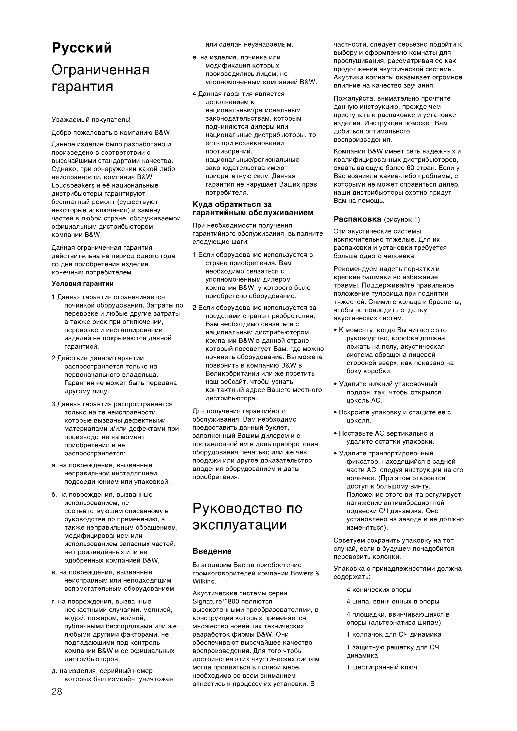 Уважаемый покупатель! Добро пожаловать в компанию B&W! Данное изделие было разработано и произведено в соответствии с высочайшими стандартами качества. Однако, при обнаружении какой-либо неисправности, компания B&W Loudspeakers и её национальные дистрибьюторы гарантируют бесплатный ремонт (существуют некоторые исключения) и замену частей в любой стране, обслуживаемой официальным дистрибьютором компании B&W. Данная ограниченная гарантия действительна на период одного года со дня приобретения изделия конечным потребителем. Условия гарантии 1 Данная гарантия ограничивается починкой оборудования. Затраты по перевозке и любые другие затраты, а также риск при отключении, перевозке и инсталлировании изделий не покрываются данной