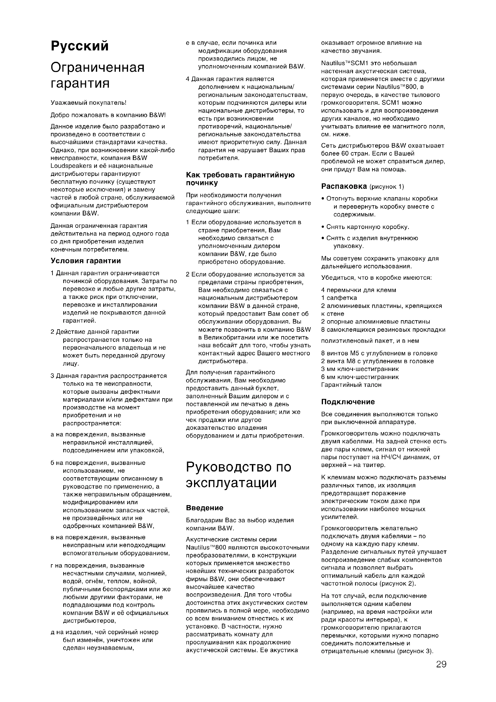 Уважаемый покупатель! Добро пожаловать в компанию B&W! Данное изделие было разработано и произведено в соответствии с высочайшими стандартами качества. Однако, при возникновении какой-либо неисправности, компания B&W Loudspeakers и её национальные дистрибьютеры гарантируют бесплатную починку (существуют некоторые исключения) и замену частей в любой стране, обслуживаемой официальным дистрибьютером компании B&W. Данная ограниченная гарантия действительна на период одного года со дня приобретения изделия конечным потребителем. Условия гарантии 1 Данная гарантия ограничивается починкой оборудования. Затраты по перевозке и любые другие затраты, а также риск при отключении, перевозке и инсталлировании изделий не покрываются данной