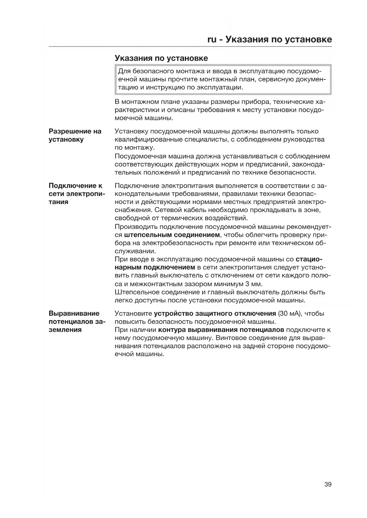 Установите устройство защитного отключения (30мА), чтобы повысить безопасность посудомоечной машины. При наличии контура выравнивания потенциалов подключите к нему посудомоечную машину. Винтовое соединение для вырав- нивания потенциалов расположено на задней стороне посудомо- ечной машины.ru - Указания по установке