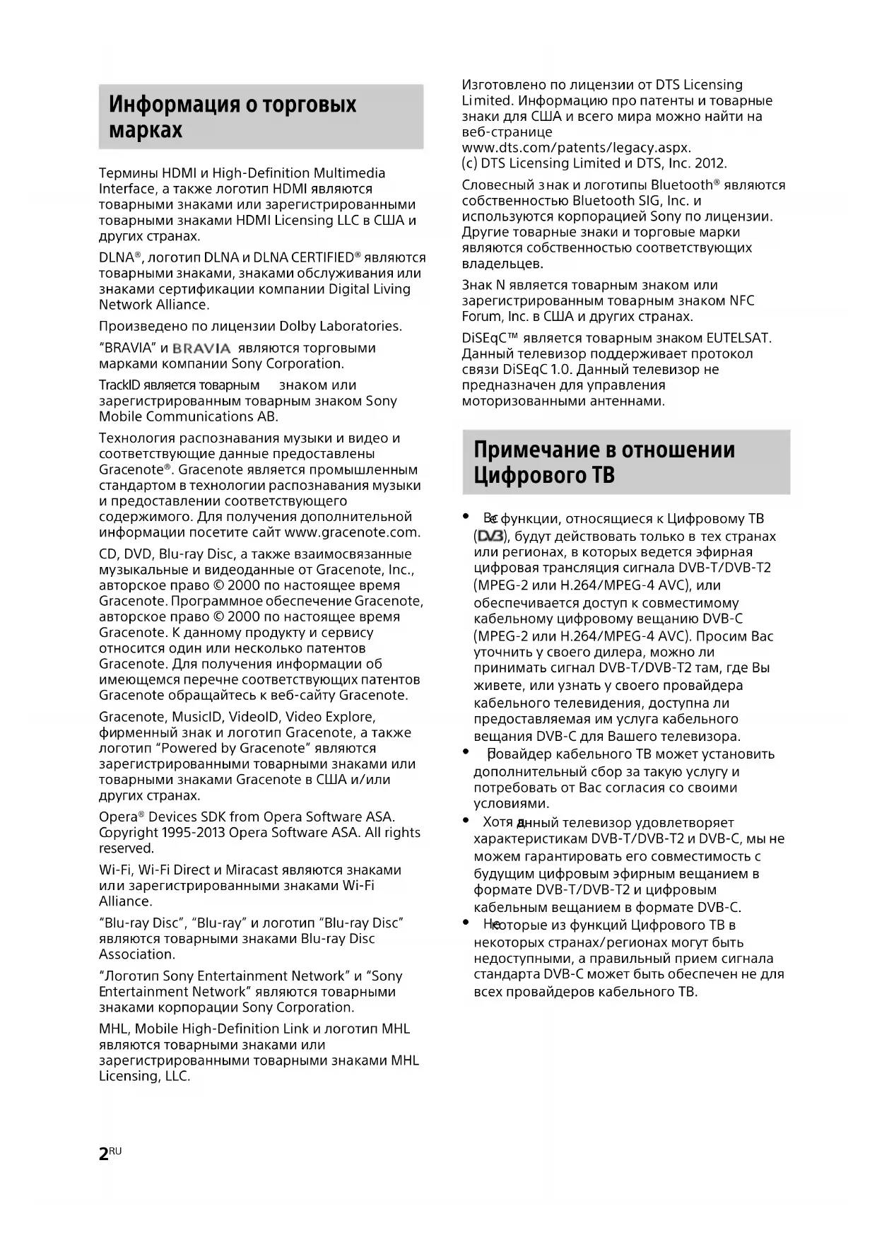 рными знаками, знаками обслуживания или знаками сертификации компании Digital Living Network Alliance. Произведено по лицензии Dolby Laboratories. “BRAVIA” и являются торговыми марками компании Sony Corporation. TrackID является товарным