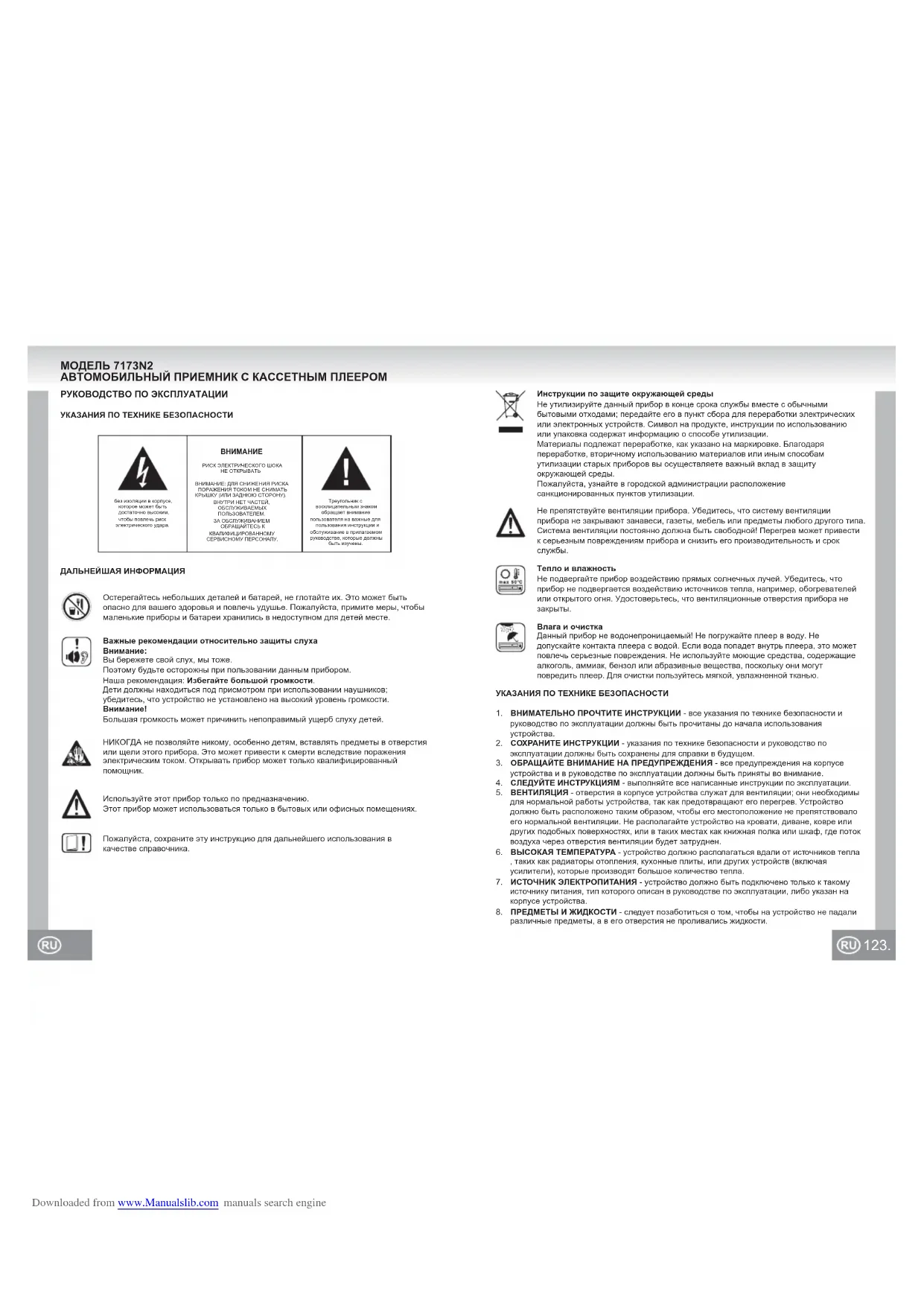 различные предметы, а в его отверстия не проливались жидкости.без изоляции в корпусе, которое может быть достаточно высоким, чтобы повлечь риск электрического удара.Треугольник с восклицательным знаком обращает внимание пользователя на важные для пользования инструкции и обслуживание в прилагаемом руководстве, которые должны быть изучены.ВНИМАНИЕРИСК ЭЛЕКТРИЧЕСКОГО ШОКАНЕ ОТКРЫВАТЬВНИМАНИЕ: ДЛЯ СНИЖЕНИЯ РИСКА ПОРАЖЕНИЯ ТОКОМ НЕ СНИМАТЬ КРЫШКУ (ИЛИ ЗАДНЮЮ СТОРОНУ).ВНУТРИ НЕТ ЧАСТЕЙ, ОБСЛУЖИВАЕМЫХ ПОЛЬЗОВАТЕЛЕМ.ЗА ОБСЛУЖИВАНИЕМ ОБРАЩАЙТЕСЬ К КВАЛИФИЦИРОВАННОМУ СЕРВИСНОМУ ПЕРСОНАЛУ. МОДЕЛЬ 7173N2 АВТОМОБИЛЬНЫЙ ПРИЕМНИК С КАССЕТНЫМ ПЛЕЕРОМ Не препятствуйте вентиляции прибора. Убедитесь, что систему вентиляции прибора не закрывают занавеси, газеты, мебель или предметы любого другого типа. Система вентиляции постоянно должна быть свободной! Перегрев может привести к серьезным повреждениям прибора и снизить его производительность и срок службы.Пожалуйста, сохраните эту инструкцию для дальнейшего использования в качестве справочника.Инструкции по защите окружающей средыНе утилизируйте данный прибор в конце срока службы вместе с обычными бытовыми отходами; передайте его в пункт сбора для переработки электрических или электронных устройств. Символ на продукте, инструкции по использованию или упаковка содержат информацию о способе утилизации.Материалы подлежат переработке, как указано на маркировке. Благодаря переработке, вторичному использованию материалов или иным способам утилизации старых приборов вы осуществляете важный вклад в защиту окружающей среды.Пожалуйста, узнайте в городской администрации расположение санкционированных пунктов утилизации.Тепло и влажностьНе подвергайте прибор воздействию прямых солнечных лучей. Убедитесь, что прибор не подвергается воздействию источников тепла, например, обогревателей или открытого огня. Удостоверьтесь, что вентиляционные отверстия прибора не закрыты.Влага и очисткаДанный прибор не водонепроницаемый! Не погружайте плеер в воду. Не допускайте контакта плеера с водой. Если вода попадет внутрь плеера, это может повлечь серьезные повреждения. Не используйте моющие средства, содержащие алкоголь, аммиак, бензол или абразивные вещества, поскольку они могут повредить плеер. Для очистки пользуйтесь мягкой, увлажненной тканью.НИКОГДА не позволяйте никому, особенно детям, вставлять предметы в отверстия или щели этого прибора. Это может привести к смерти вследствие поражения электрическим током. Открывать прибор может только квалифицированный помощник.Остерегайтесь небольших деталей и батарей, не глотайте их. Это может быть опасно для вашего здоровья и повлечь удушье. Пожалуйста, примите меры, чтобы маленькие приборы и батареи хранились в недоступном для детей месте.Важные рекомендации относительно защиты слухаВнимание:Вы бережете свой слух, мы тоже.Поэтому будьте осторожны при пользовании данным прибором.Наша рекомендация: Избегайте большой громкости.Дети должны находиться под присмотром при использовании наушников; убедитесь, что устройство не установлено на высокий уровень громкости.Внимание!Большая громкость может причинить непоправимый ущерб слуху детей.Используйте этот прибор только по предназначению.Этот прибор может использоваться только в б
