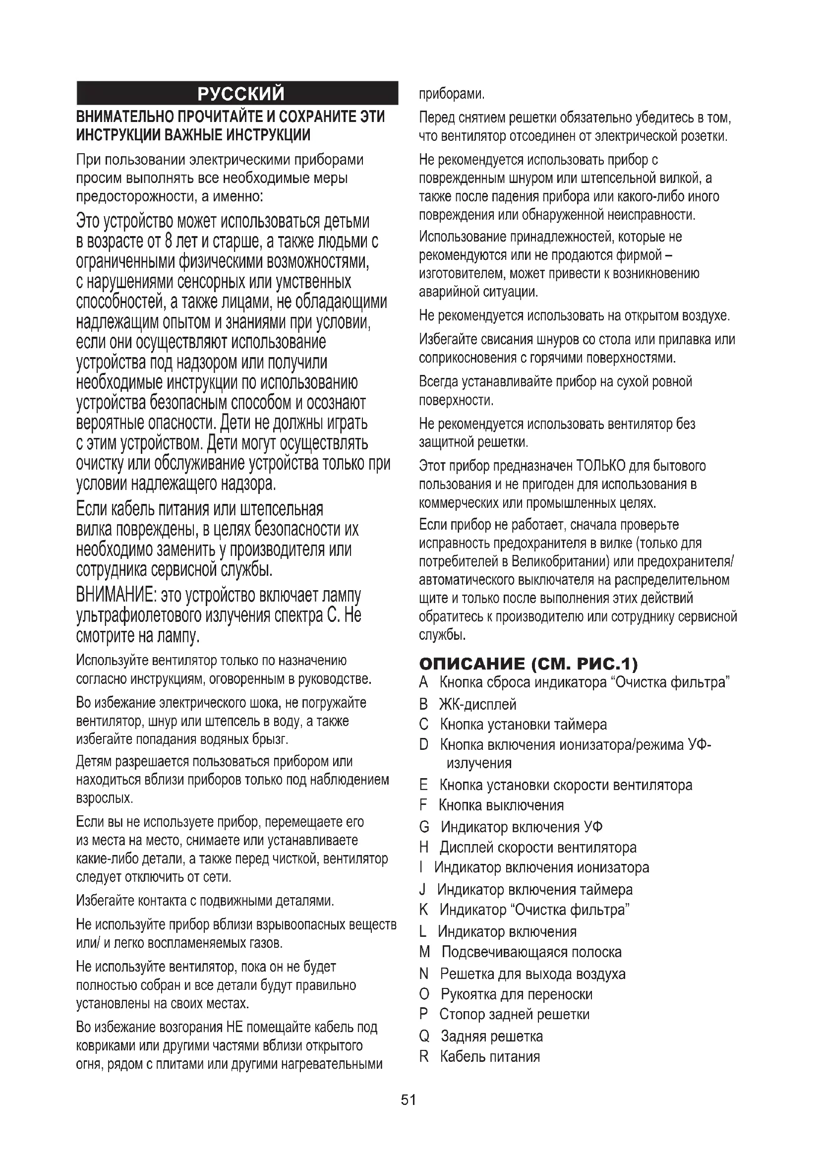 ВНИМАТЕЛЬНО ПРОЧИТАЙТЕ И СОХРАНИТЕ ЭТИ ИНСТРУКЦИИ ВАЖНЫЕ ИНСТРУКЦИИ При пользовании электрическими приборами просим выполнять все необходимые меры предосторожности, а именно: Это устройство может использоваться детьми в возрасте от 8 лет и старше, а также людьми с ограниченными физическими возможностями, с нарушениями сенсорных или умственных способностей, а также лицами, не обладающими надлежащим опытом и знаниями при условии, если они осуществляют использование устройства под надзором или получили необходимые инструкции по использованию устройства безопасным способом и осознают вероятные опасности. Дети не должны играть с этим устройством. Дети могут осуществлять очистку или обслуживание устройства только при условии надлежащего надзора. Если кабель питания или штепсельная вилка повреждены, в целях безопасности их необходимо заменить у производителя или сотрудника сервисной службы. ВНИМАНИЕ: это устройство включает лампу ультрафиолетового излучения спектра С. Не смотрите на лампу. Используйте вентилятор только по назначению согласно инструкциям, оговоренным в руководстве. Во избежание электрического шока, не погружайте вентилятор, шнур или штепсель в воду, а также избегайте попадания водяных брызг. Детям разрешается пользоваться прибором или находиться вблизи приборов только под наблюдением