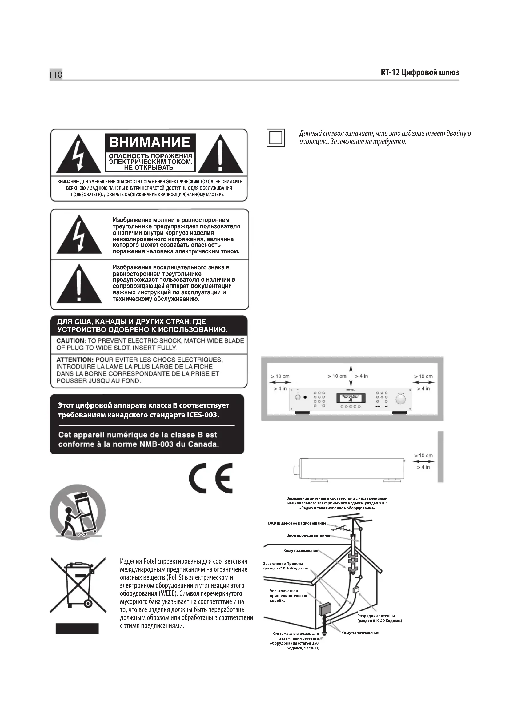 ОПАСНОСТЬ ПОРАЖЕНИЯ ЭЛЕКТРИЧЕСКИМ ТОКОМ. НЕ ОТКРЫВАТЬВНИМАНИЕ: ДЛЯ УМЕНЬШЕНИЯ ОПАСНОСТИ ПОРАЖЕНИЯ ЭЛЕКТРИЧЕСКИМ ТОКОМ, НЕ СНИМАЙТЕ ВЕРХНЮЮ И ЗАДНЮЮ ПАНЕЛЬ! ВНУТРИ НЕТ ЧАСТЕЙ, ДОСТУПНЫХ ДЛЯ ОБСЛУЖИВАНИЯ ПОЛЬЗОВАТЕЛЮ. ДОВЕРЬТЕ ОБСЛУЖИВАНИЕ КВАЛИФИЦИРОВАННОМУ МАСТЕРУ. ДЛЯ США, КАНАДЫ И ДРУГИХ СТРАН, ГДЕ УСТРОЙСТВО ОДОБРЕНО К ИСПОЛЬЗОВАНИЮ. Изображение молнии в равностороннем треугольнике предупреждает пользователя о наличии внутри корпуса изделия неизолированного напряжения, величина которого может создавать опасность поражения человека электрическим током. Изображение восклицательного знака в равностороннем треугольнике предупреждает пользователя о наличии в сопровождающей аппарат документации важных инструкций по эксплуатации и техническому обслуживанию. Заземление антенны в соответствии с наставлениями национального электрического Кодекса, раздел 810: «Радио и телевизионное оборудование» Ввод провода антенны DAB (цифровое радиовещание) Хомут заземления Хомуты заземления Разрядник антенны (раздел 810 20 Кодекса) Заземление Провода (раздел 810 20 Кодекса) Система электродов для заземления сетевого оборудования (статья 250 Кодекса, Часть H) Электрическая присоединительная коробка111
