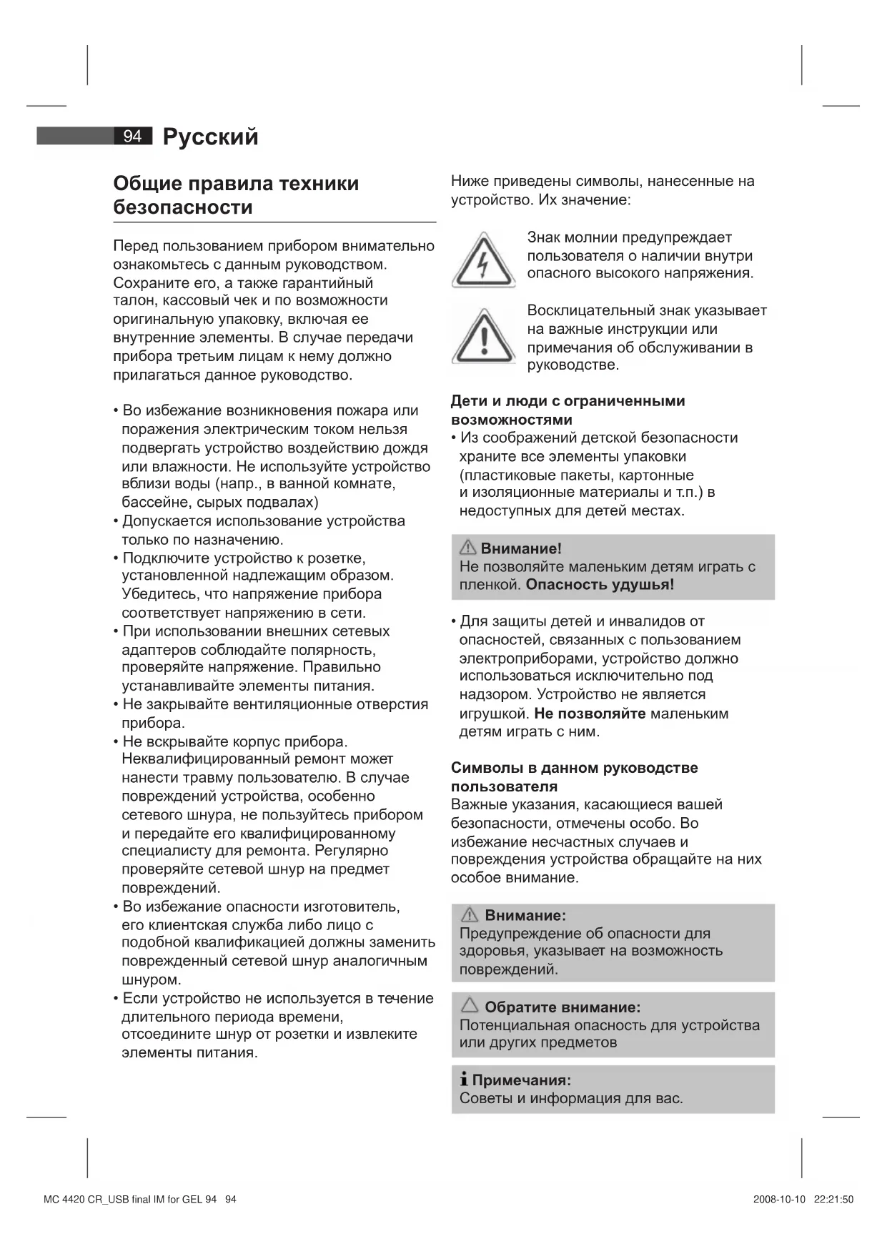 - Убедитесь, что напряжение в сети соответствует данным, приведенным в табличке с техническими данными. Установка элементов питания Примечание: Литиевые элементы питания в батарейном отсеке пульта ДУ обернуты фольгой на время транспортировки. Благодаря этому увеличивается срок службы батарей. Перед началом использования пульта ДУ снимите фольгу. MC 4420 CR_USB final IM for GEL 95 95MC 4420 CR_USB final IM for GEL 95 95 2008-10-10 22:21:532008-10-10 22:21:5396 В качестве элементов питания пульта ДУ служат литиевые батареи с увеличенным сроком службы. Если в ходе эксплуатации дальность действия пульта ДУ уменьшилось, выполните следующие
