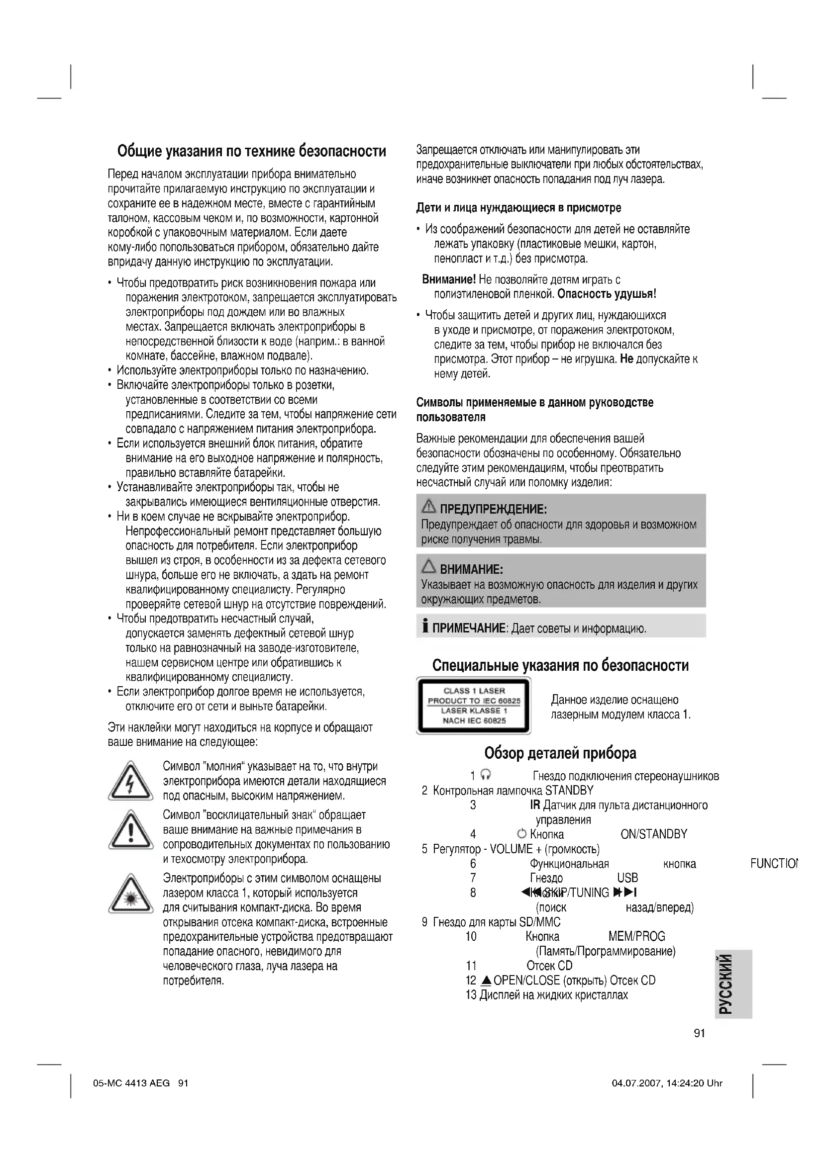 OPEN/CLOSE (открыть) Отсек CD 13 Дисплей на жидких кристаллах 05-MC 4413 AEG 91 04.07.2007, 14:24:20 Uhr92