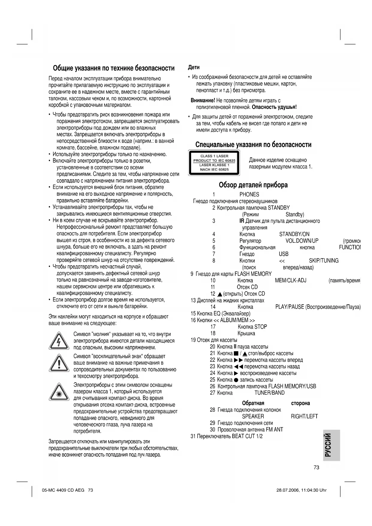 29 Гнездо подключения сети 30 Проволочная антенна FM ANT 31 Переключатель BEAT CUT 1/2 05-MC 4409 CD AEG 73 28.07.2006, 11:04:30 Uhr74