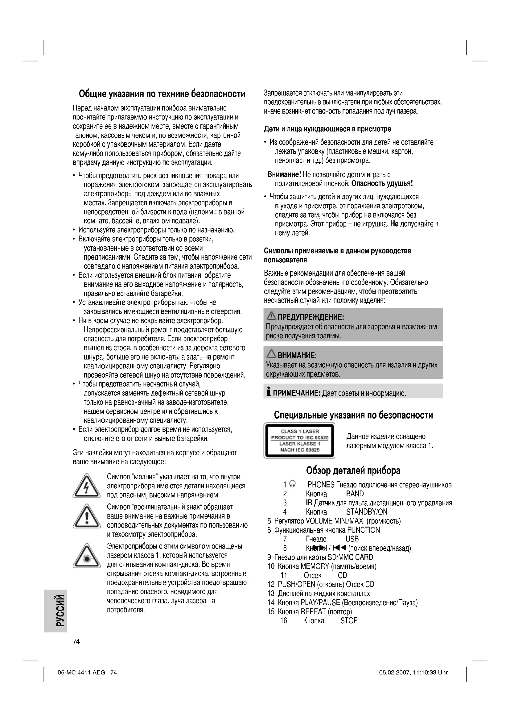 РУКОВОДСТВО ПОЛЬЗОВАТЕЛЯ MC 4411 CDMP3 AEG