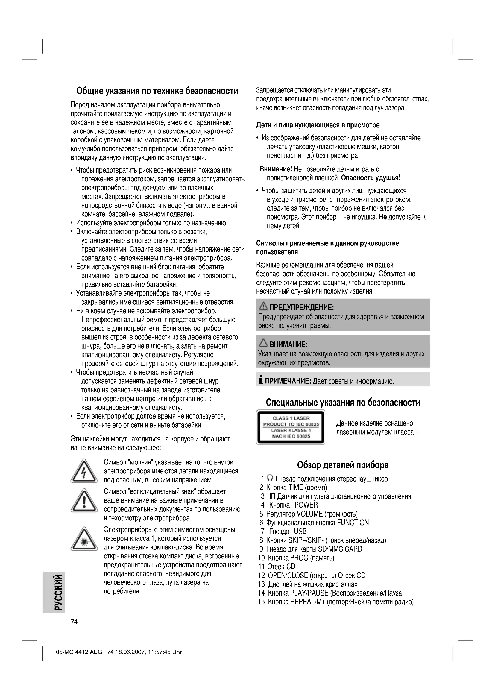 Указывает на возможную опасность для изделия и других окружающих предметов. ПРИМЕЧАНИЕ: Дает советы и информацию. Специальные указания по безопасности Данное изделие оснащено лазерным модулем класса 1. Обзор деталей прибора 1 Гнездо подключения стереонаушников 2 Кнопка TIME (время) 3 IR Датчик для пульта дистанционного управления 4 Кнопка POWER 5 Регулятор VOLUME (громкость) 6 Функциональная кнопка FUNCTION 7 Гнездо USB 8 Кнопки SKIP+/SKIP- (поиск вперед/назад) 9 Гнездо для карты SD/MMC CARD 10 Кнопка PROG (память) 11 Отсек CD 12 OPEN/CLOSE (открыть) Отсек CD 13 Дисплей на жидких кристаллах 14 Кнопка PLAY/PAUSE (Воспроизведение/Пауза) 15 Кнопка REPEAT/M+ (повтор/Ячейка помяти радио) 05-MC 4412 AEG 74 18.06.2007, 11:57:45 UhrРУССКИЙ