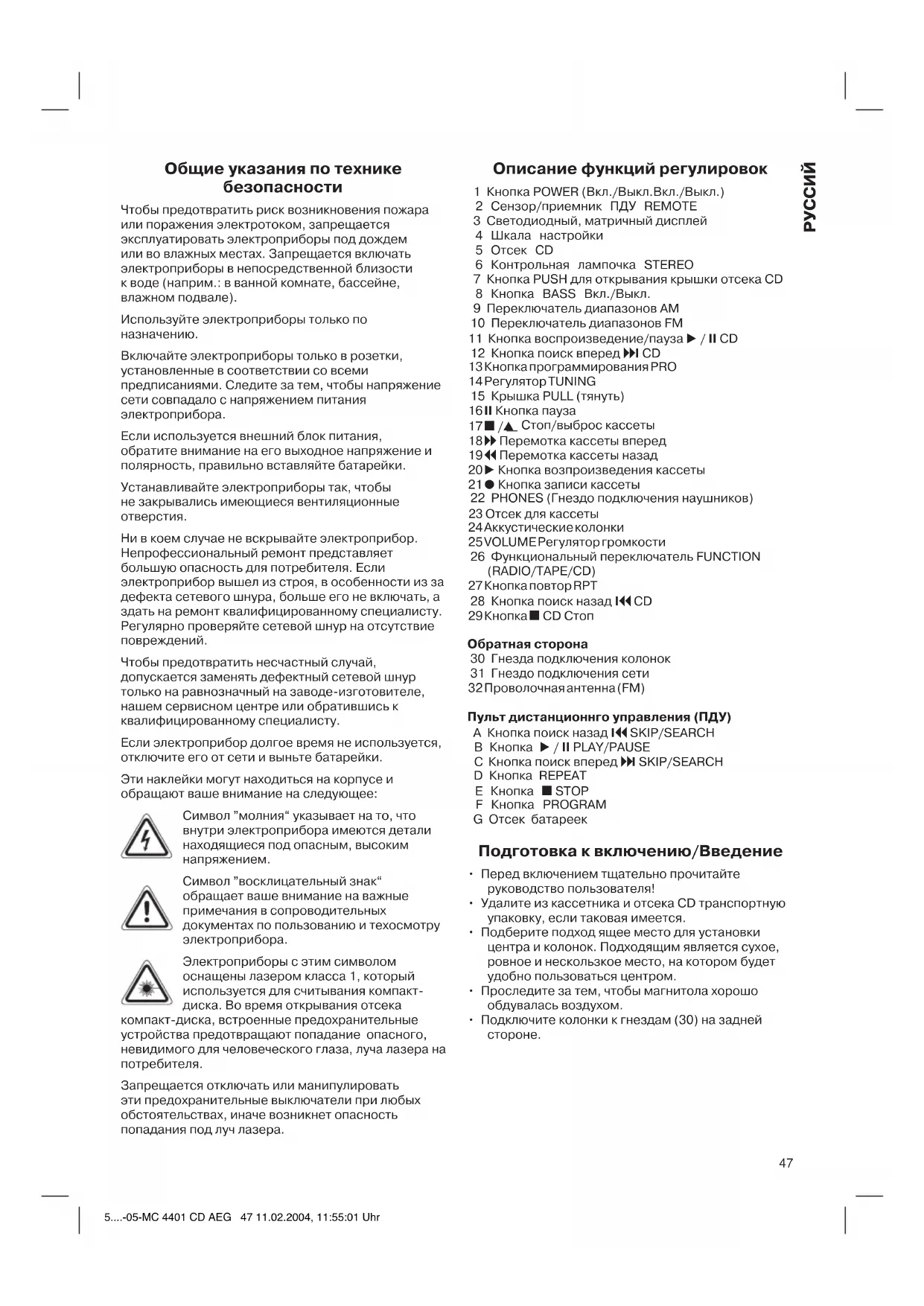 Ни в коем случае не вскрывайте электроприбор. Непрофессиональный ремонт представляет большую опасность для потребителя. Если электроприбор вышел из строя, в особенности из за дефекта сетевого шнура, больше его не включать, а здать на ремонт квалифицированному специалисту. Регулярно проверяйте сетевой шнур на отсутствие повреждений. Чтобы предотвратить несчастный случай, допускается заменять дефектный сетевой шнур только на равнозначный на заводе-изготовителе, нашем сервисном центре или обратившись к квалифицированному специалисту. Если электроприбор долгое время не используется, отключите его от сети и выньте батарейки. Эти наклейки могут находиться на корпусе и обращают ваше внимание на следующее: Символ ”молния“ указывает на то, что внутри электроприбора имеются детали находящиеся под опасным, высоким напряжением. Символ ”восклицательный знак“ обращает ваше внимание на важные примечания в сопроводительных документах по пользованию и техосмотру электроприбора. Электроприборы с этим символом оснащены лазером класса 1, который используется для считывания компакт- диска. Во время открывания отсека компакт-диска, встроенные предохранительные устройства предотвращают попадание опасного, невидимого для человеческого глаза, луча лазера на потребителя. Запрещается отключать или манипулировать эти предохранительные выключатели при любых обстоятельствах, иначе возникнет опасность попадания под луч лазера. Описание функций регулировок 1 Кнопка POWER (Вкл./Выкл.Вкл./Выкл.) 2 Сензор/приемник ПДУ REMOTE 3 Cветодиодный, матричный дисплей 4 Шкала настройки 5 Отсек CD 6 Контрольная лампочка STEREO 7 Кнопка PUSH для открывания крышки отсека CD 8 Кнопка BASS Вкл./Выкл. 9 Переключатель диапазонов AM 10 Переключатель диапазонов FM 11 Кнопка воспроизведение/пауза / II CD 12 Кнопка поиск вперед I CD 13 Кнопка программирования PRO 14 Регулятор TUNING 15 Крышка PULL (тянуть) 16 II Кнопка пауза 17 / Стоп/выброс кассеты 18 Перемотка кассеты вперед 19 Перемотка кассеты назад 20 Кнопка возпроизведения кассеты 21 Кнопка записи кассеты 22 PHONES (Гнездо подключения наушников) 23 Отсек для кассеты 24 Аккустические колонки 25 VOLUME Регулятор громкости 26 Функциональный переключатель FUNCTION (RADIO/TAPE/CD) 27 Кнопка повтор RPT 28 Кнопка поиск назад I CD 29 Кнопка CD Стоп Обратная сторона 30 Гнезда подключения колонок 31 Гнездо подключения сети 32 Проволочная антенна (FM) Пульт дистанционнго управления (ПДУ) A Кнопка поиск назад I SKIP/SEARCH B Кнопка / II PLAY/PAUSE C Кнопка поиск вперед I SKIP/SEARCH D Кнопка REPEAT E Кнопка STOP F Кнопка PROGRAM G Отсек батареек Подготовка к включению/Введение