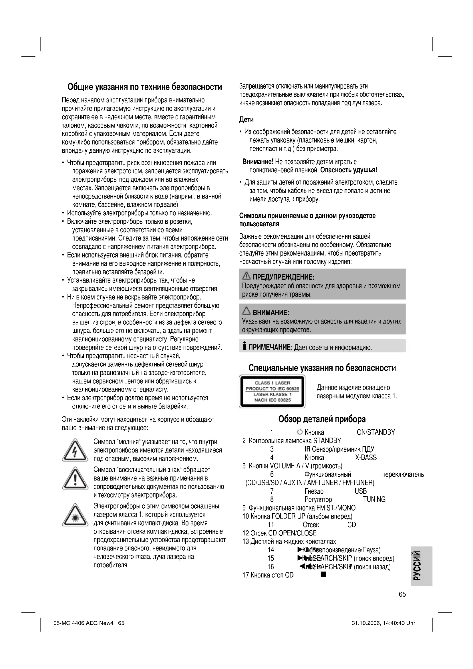 РУКОВОДСТВО ПОЛЬЗОВАТЕЛЯ MC 4406 CD AEG