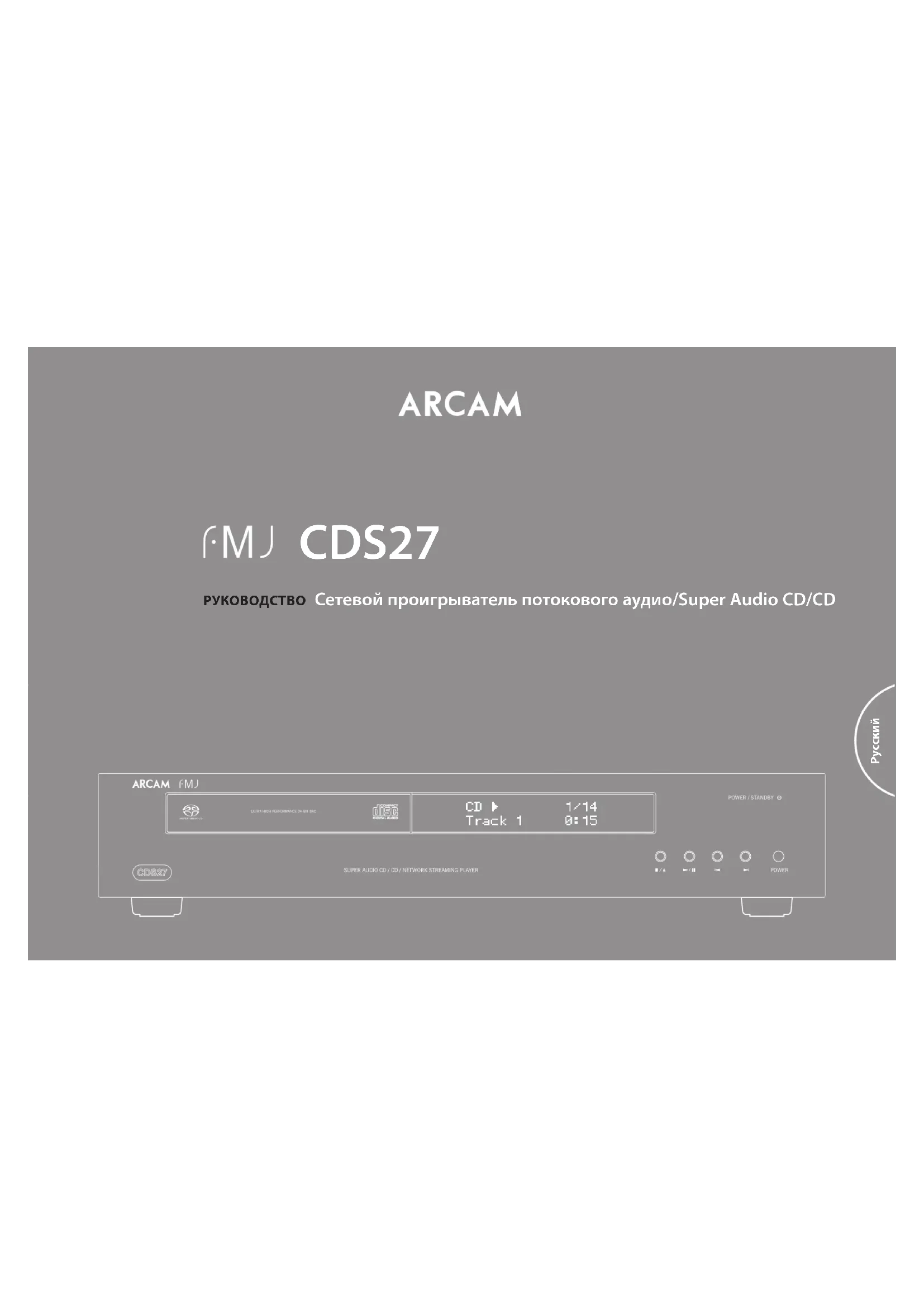 неисправностей При возникновении ошибки, проверьте таблицу устранения неисправностей прежде чем отправить устройство в ремонт.Если проблема не решена, попробуйте выключить и включить устройство снова.Если проблема не устранена, обращайтесь к вашему поставщику. Ни при каких обстоятельствах не следует производить ремонт устройства самостоятельно, так как это может привести к аннулированию гарантии! Политика непрерывного совершенствования Arcam ведет политику непрерывного совершенствования для всех своих продуктов. Это означает, что дизайн и спецификации могут меняться без какого либо уведомления. cпецификации Аналоговый аудиовыходПреобразование цифрового в аналоговое24-разрядный DAC Delta_Sigma на 192 кГцСоотношение шум/сигнал 110Дб CCIRГармоническое искажение (1 кГц) 0,002%Частотная характеристика (±0,5 Дб) 10 Гц-20 кГцУровень выхода (0 Дб) 2,2 VrmsИмпеданс выхода 47 ОмМинимальная рекомендуемая нагрузка5 кОмЦифровые интерфейсыАудиовыходы 75 Ом коаксиальный/оптический выход TOSLINKUSB USB 2.0 высокоскоростной (480 Мбит/с)Сеть Ethernet 10/100 10/100Беспроводной b/g/nФизическийГабаритные размеры (Ш x Д x В) 433 x 276 x 75Вес Коробка 5,2 кг/7,5 кгЭнергопотребление 20 Вт макс. Аксессуары в комплектеКабель электропитания, пульт ДУ CR902, 2 батарейки AAA, антенна Wi-FiE&OEПримечание: Все значения спецификации типичны если не указано иное Радиопомехи Проигрыватель CDS27 – цифровое устройство, разработанное в соответствии с высочайшими требованиями стандартов по электросовместимости.Все CD-проигрыватели генерируют и могут излучать энергию электромагнитного излучения. В некоторых случаях это может создавать помехи в получении FM и AM радиосигналов. В таком случае, храните плеер и его соединительные кабели как можно дальше от тюнера и его антенн. Подключение плеера и тюнера к различным розеткам электросети также поможет уменьшить помехи.СТРАНЫ EC – Это продукты были разработаны, чтобы соответствовать EMC Директиве 2004/108/ EC. USA – Эти продукты соответствуют Части 15 FCC. Класс Б. Лазерная радиация При эксплуатации проигрывателя CDS27 со снятой внешней крышкой, невидимое лазерное излучение может повредить органы зрения.ИЗДЕЛИЕ КЛАССА IIЛАЗЕРНОЙ ОПАСНОСТИ РусскийR-14