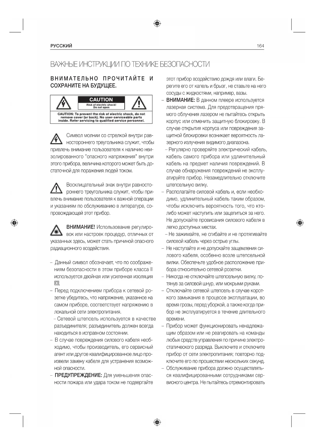 – Перед подключением прибора к сетевой ро- зетке убедитесь, что напряжение, указанное на самом приборе, соответствует напряжению в локальной сети электропитания. – Сетевой штепсель используется в качестве разъединителя; разъединитель должен всегда находиться в исправном состоянии. – В случае повреждения силового кабеля необ- ходимо, чтобы производитель, его сервисный агент или другое квалифицированное лицо про- извели замену кабеля для устранения возмож- ной опасности. – ПРЕДУПРЕЖДЕНИЕ: Для уменьшения опас- ности пожара или удара током не подвергайте ВАЖНЫЕ ИНСТРУКЦИИ ПО ТЕХНИКЕ БЕЗОПАСНОСТИ этот прибор воздействию дождя или влаги. Бе- регите его от капель и брызг, не ставьте на него сосуды с жидкостями, например, вазы. – ВНИМАНИЕ: В данном плеере используется лазерная система. Для предотвращения пря- мого облучения лазером не пытайтесь открыть корпус или отменить защитную блокировку. В случае открытия корпуса или повреждения за- щитной блокировки возникает вероятность ла- зерного излучения видимого диапазона. – Регулярно проверяйте электрический кабель, кабель самого прибора или удлинительный кабель на предмет наличия повреждений. В случае обнаружения повреждений не эксплу- атируйте прибор. Незамедлительно отключите штепсельную вилку. – Располагайте силовой кабель и, если необхо- димо, удлинительный кабель таким образом, чтобы исключить вероятность того, что кто- либо может наступить или зацепиться за него. Не допускайте провисания силового кабеля в легко доступных местах. – Не зажимайте, не сгибайте и не протягивайте силовой кабель через острые углы. – Не наступайте и не допускайте защемления си- лового кабеля, особенно возле штепсельной вилки. Обеспечьте удобное расположение при- бора относительно сетевой розетки. – Никогда не отключайте штепсельную вилку, по- тянув за силовой шнур, или мокрыми руками. – Отключайте сетевой штепсель в случае корот- кого замыкания в процессе эксплуатации, во время грозы, перед уборкой, а также когда при- бор не эксплуатируется в течение длительного