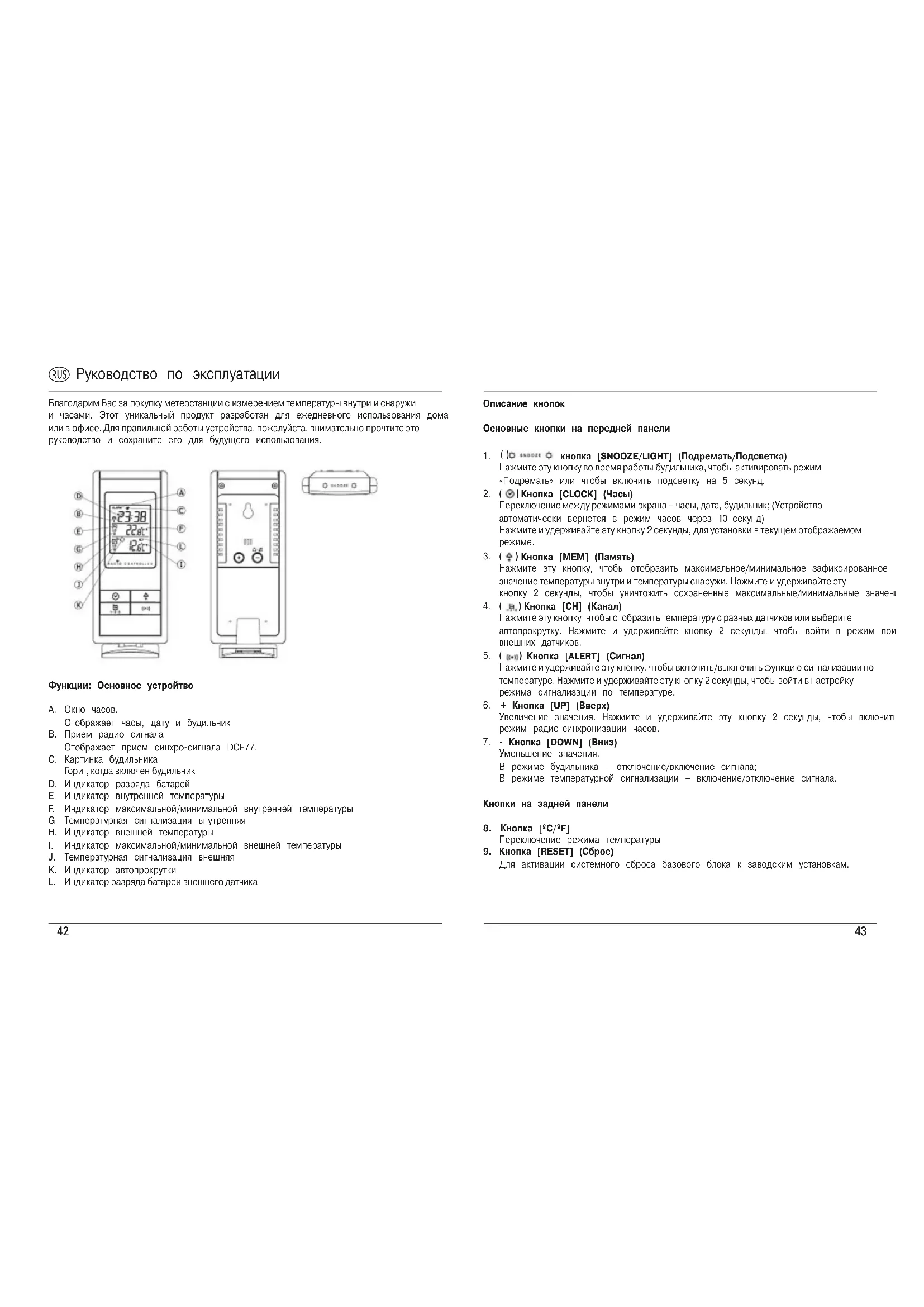 Благодарим Вас за покупку метеостанции с измерением температуры внутри и снаружи и часами. Этот уникальный продукт разработан для ежедневного использования дома или в офисе. Для правильной работы устройства, пожалуйста, внимательно прочтите это руководство и сохраните его для будущего использования. Функции: Основное устройтво