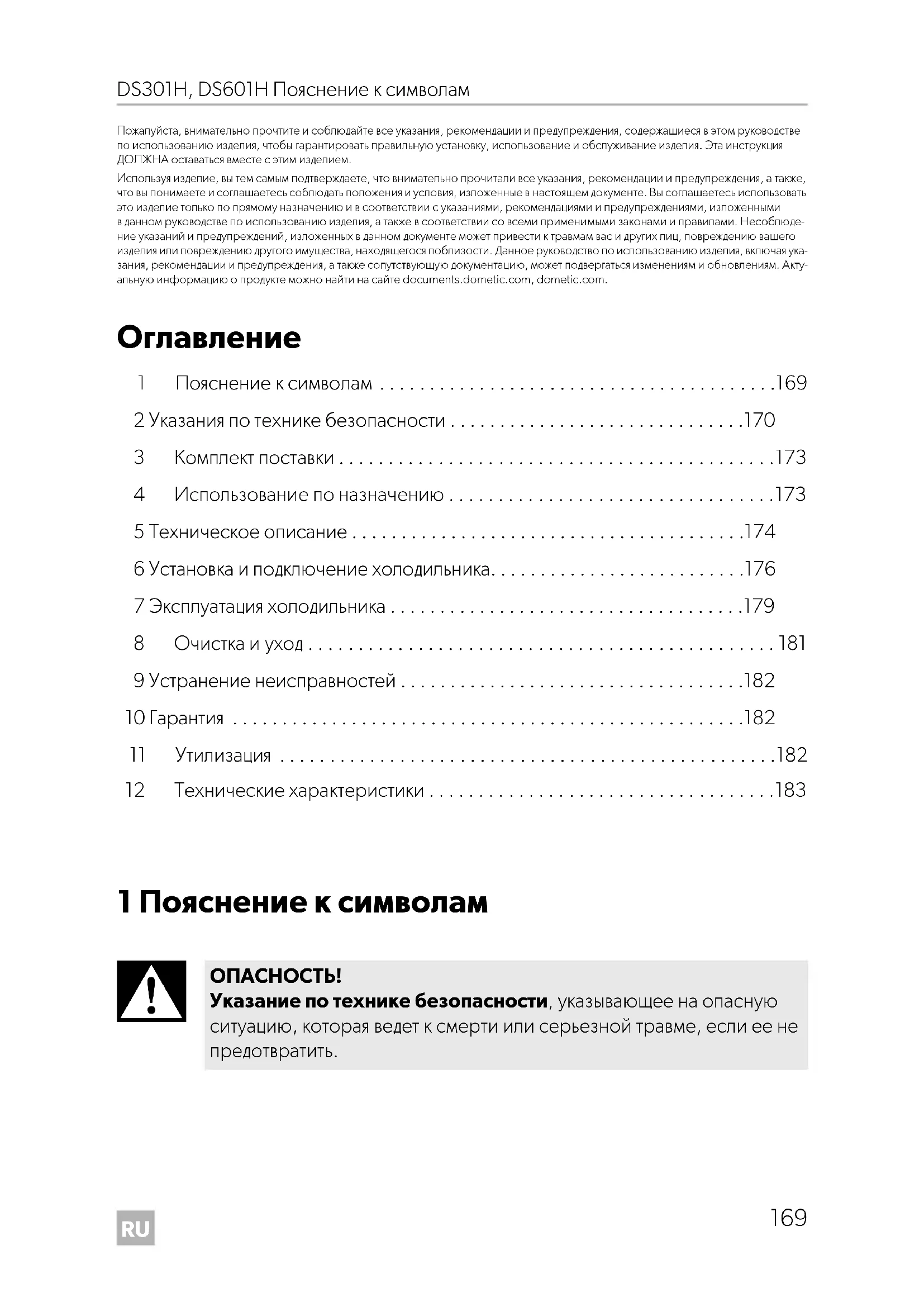 Указание по технике безопасности, указывающее на опасную ситуацию, которая ведет к смерти или серьезной травме, если ее не предотвратить. DometicDS301-601H_IOM_4445103317_EMEA16_20xx-xx-xx.book Seite 169 Montag, 22. Februar 2021 6:18 18RU Указания по технике безопасности DS301H, DS601H