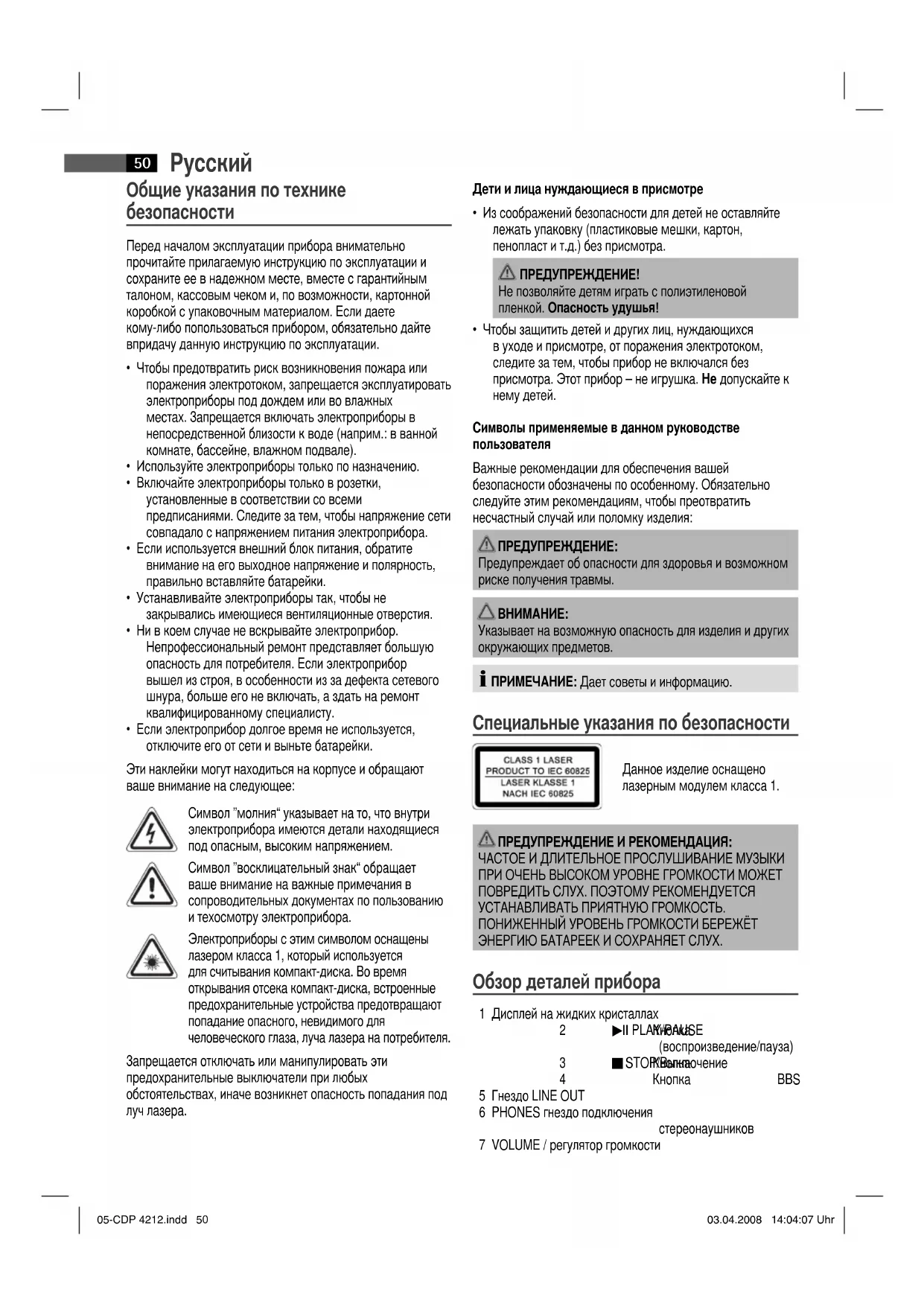 STOP/Выключение 4 Кнопка BBS 5 Гнездо LINE OUT 6 PHONES гнездо подключения стереонаушников 7 VOLUME / регулятор громкости 05-CDP 4212.indd 05-CDP 4212.indd 50 03.04.2008 14:04:07 Uhr03.04.2008 14:04:07 Uhr 50Русский 8 Oтсек CD 9 Кнопка OPEN отсек диска 10 Кнопка PROG (программирование CD) 11 Кнопка MODE 12 DC 4,5V гнездо подключения сетевого