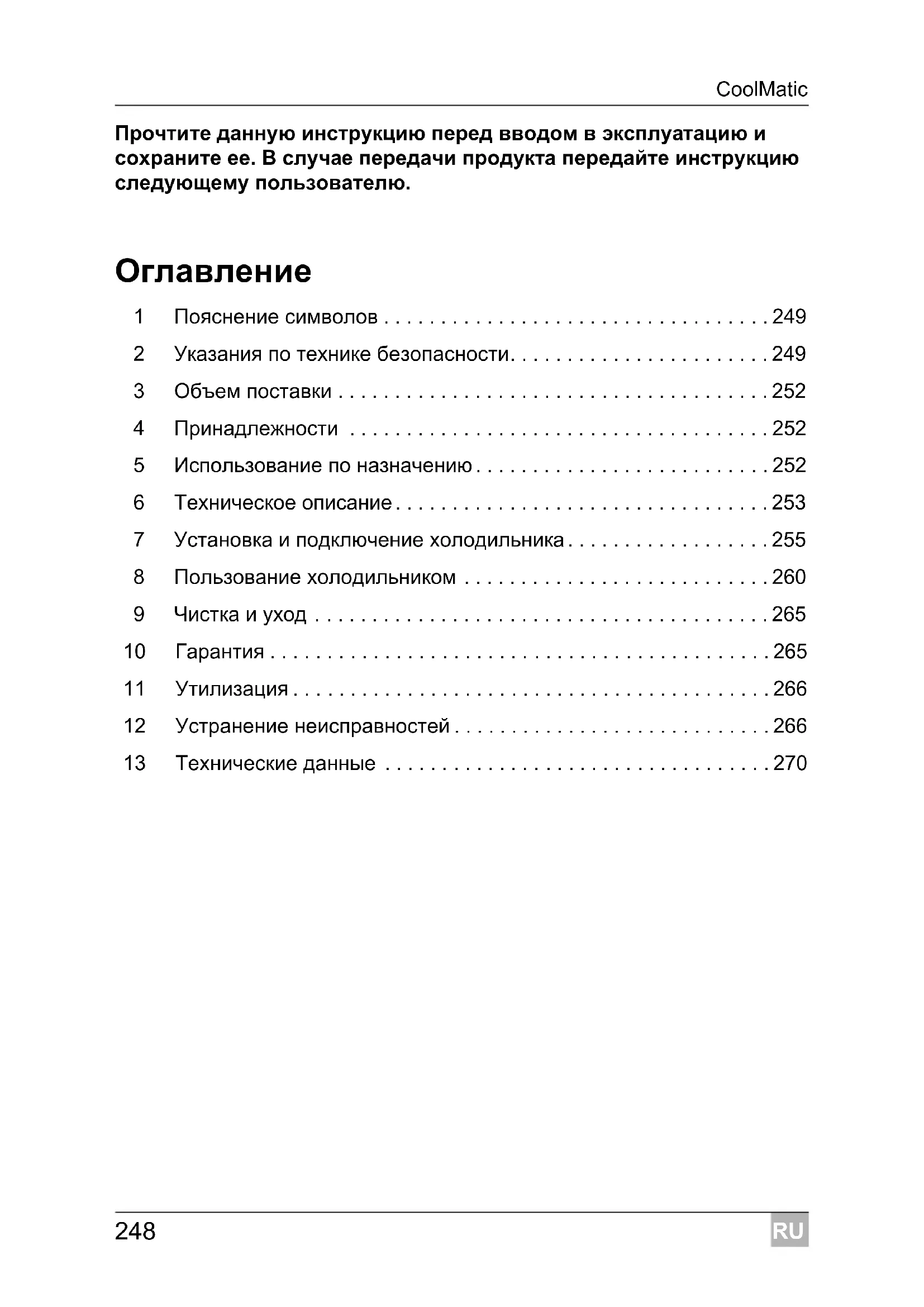 Повреждения продукта из-за механических воздействий и перенапряжений Изменения в продукте, выполненные без однозначного разрешения изготовителя Использование в целях, отличных от указанных в данной инструкцииRU Указания по технике безопасности CoolMatic