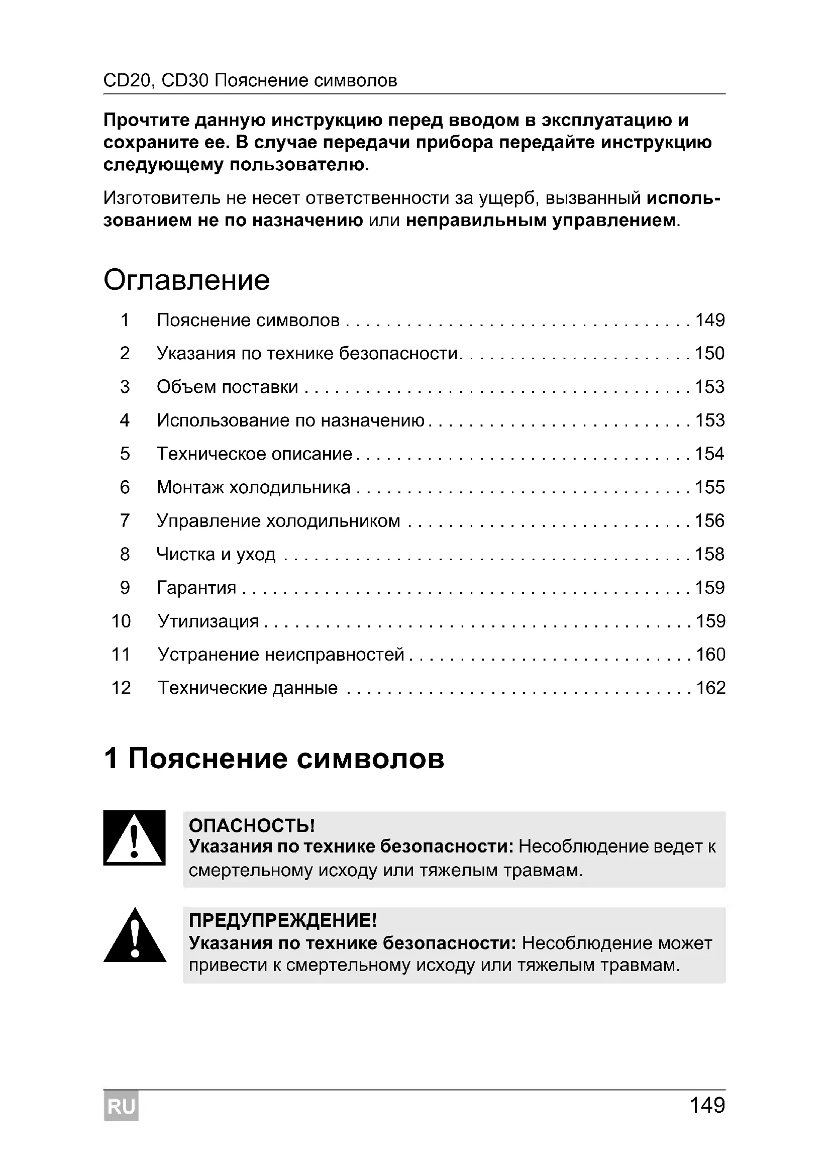 Указания по технике безопасности: Несоблюдение ведет к смертельному исходу или тяжелым травмам. ПРЕДУПРЕЖДЕНИЕ! Указания по технике безопасности: Несоблюдение может привести к смертельному исходу или тяжелым травмам.RU Указания по технике безопасности CD20, CD30