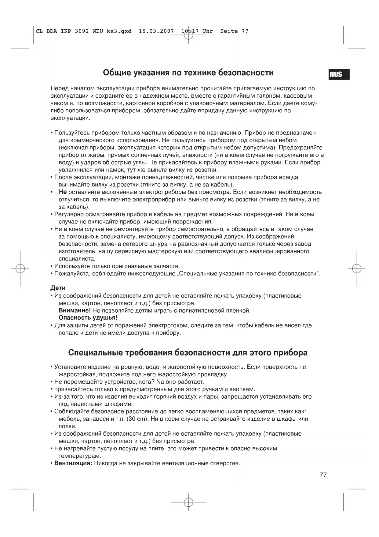 - Вентиляция: Никогда не закрывайте вентиляционные отверстия. CL_BDA_IKP_3092_NEU_ka3.qxd 15.03.2007 10:17 Uhr Seite 7778 RUS