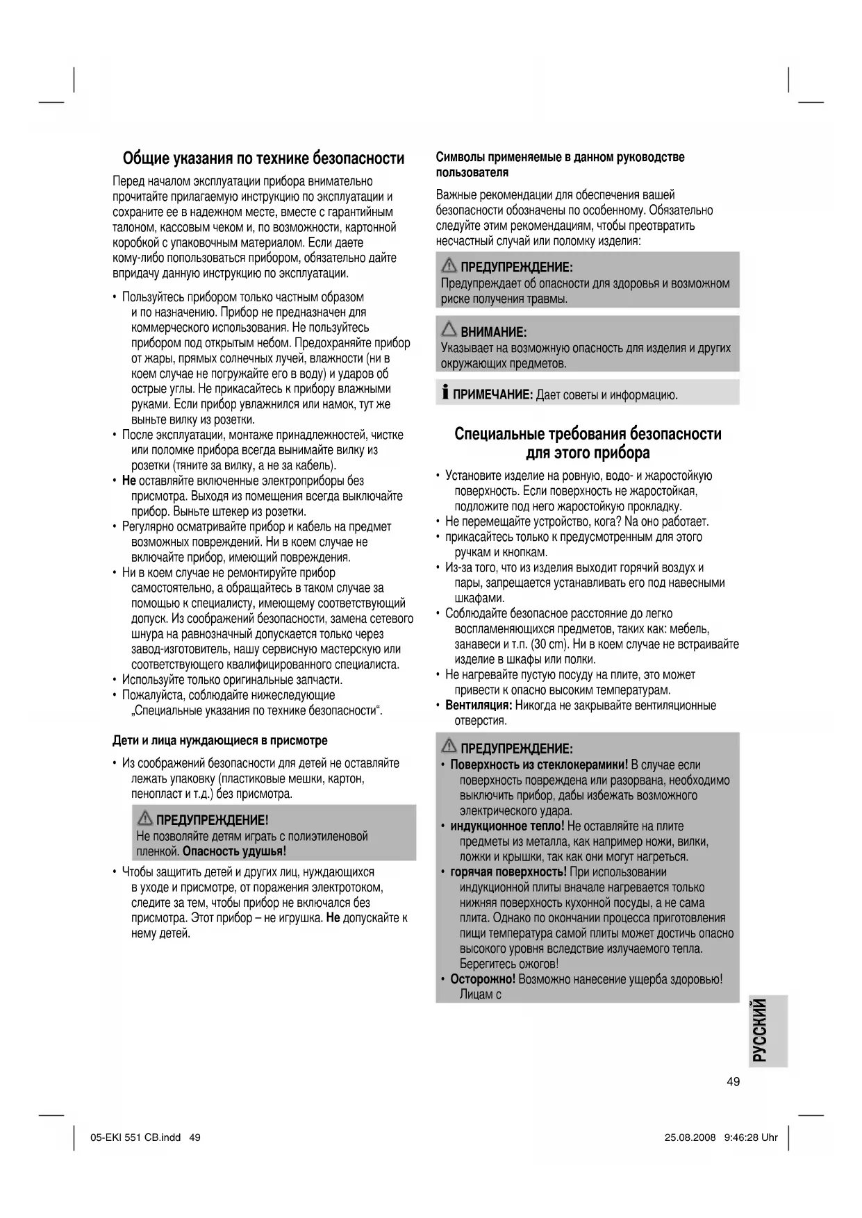 - Следите за тем, чтобы вода не попала в отверстия корпуса. Это может привести к повреждению плиты или к электрическому удару. 05-EKI 551 CB.indd 5105-EKI 551 CB.indd 51 25.08.2008 9:46:29 Uhr25.08.2008 9:46:29 Uhr52