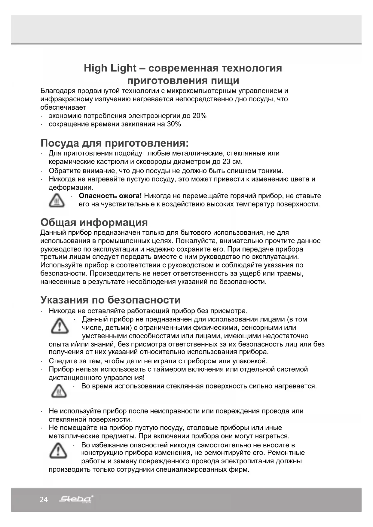 Не допускайте попадания воды на поверхность прибора, не погружайте прибор в воду. Опасность удара током! Проблемы и устранение неисправностей Уважаемый покупатель, благодарим вас за приобретение высококачественного изделия компании STEBA. Нижеследующая таблица поможет вам справиться с проблемами, которые могут возникать при использовании прибора. Многие проблемы имеют простое решение, не все, что кажется неисправностью прибора, является серьезной поломкой. Прежде, чем запросить проверку всего прибора в сервисном центре, просмотрите данную таблицу. Проблема Причина Устранение После включения штекера в розетку не загорается лампочка - нет напряжения в сети - сработал предохранитель при подключении нескольких приборов к одному источнику питания - убедиться, что штекер правильно вставлен в розетку - проверить предохранитель Зона нагрева не нагревается - время истекло - заново задать время (см. раздел об установке времени) Зона нагрева не нагревается надпись Е3 на дисплее - слишком высокая температура окружающей среды или зоны