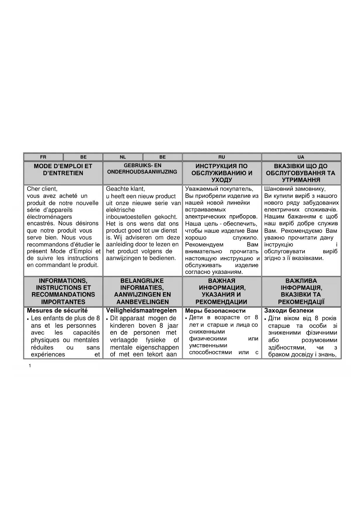 Cher client, vous avez acheté un produit de notre nouvelle série d’appareils électroménagers encastrés. Nous désirons que notre produit vous serve bien. Nous vous recommandons d’étudier le présent Mode d’Emploi et de suivre les instructions en commandant le produit. Geachte klant, u heeft een nieuw product uit onze nieuwe serie van elektrische inbouwtoestellen gekocht. Het is ons wens dat ons product goed tot uw dienst is. Wij adviseren om deze aanleiding door te lezen en het product volgens de aanwijzingen te bedienen. Уважаемый покупатель, Вы приобрели изделие из нашей новой линейки встраиваемых электрических приборов. Наша цель - обеспечить, чтобы наше изделие Вам хорошо служило. Рекомендуем Вам внимательно прочитать настоящую инструкцию и обслуживать изделие согласно указаниям. Шановний замовнику, Ви купили виріб з нашого нового ряду забудованих електричних споживачів. Нашим бажанням є щоб наш виріб добре служив Вам. Рекомендуємо Вам уважно прочитати дану інструкцію і обслуговувати виріб згідно з її вказівками. INFORMATIONS, INSTRUCTIONS ET RECOMMANDATIONS IMPORTANTES BELANGRIJKE INFORMATIES, AANWIJZINGEN EN AANBEVELINGEN